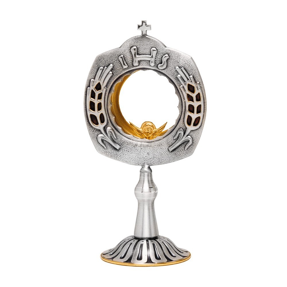 Teca eucaristica (h 27 cm) con smalto in ottone. Completa di lunetta e decori che raffigurano spighe stilizzate e scritta JHS. Articolo di alta qualità lavorato interamente da un'azienda italiana che esegue tutte le fasi di lavorazione.