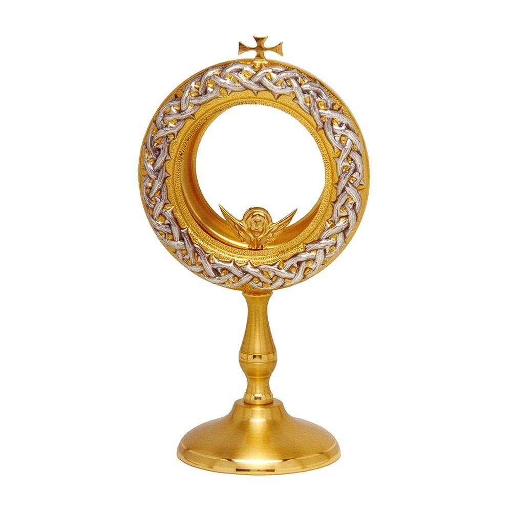 Questa teca da esposizione è in ottone oro e argento ed è raffugurata su di essa la corona di spine. L'altezza della teca è di 23 cm, con un diametro di 13 cm, ed è adatta per ostie di diametro massimo 7,5 cm. Articolo di qualità, 100% italiano.