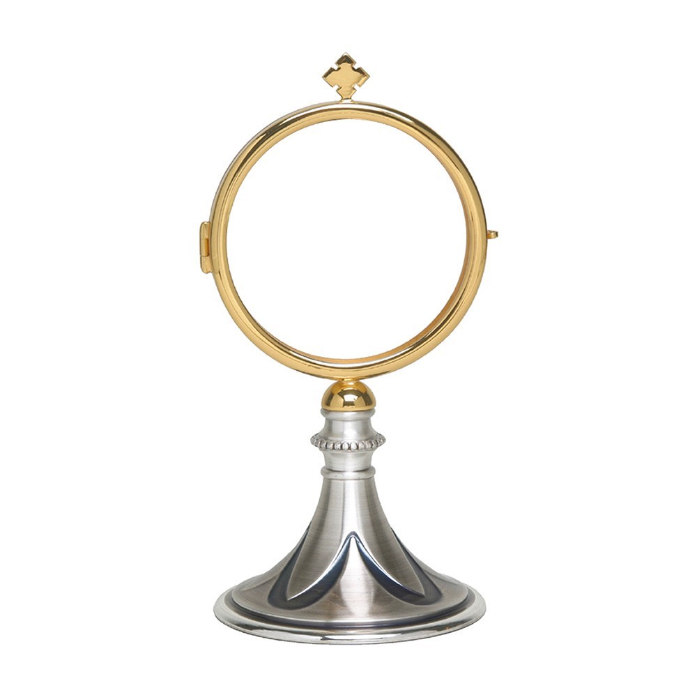 Teca per esposizione Santissmo Sacramento. La base della teca è in ottone con finitura argento ed è decorata con semplici petali. L'altezza della teca è 16 cm, con diametro di 8 cm. Adatta per ostia di diametro massimo 75 mm.