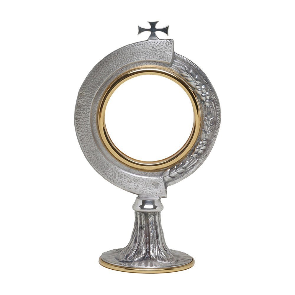 Teca da esposizione in ottone bicolore con decori raffiguranti spighe di grano. La teca è alta 19,5 cm ed è adatta per ostia di diametro massimo 7,5 cm. Made in Itay.