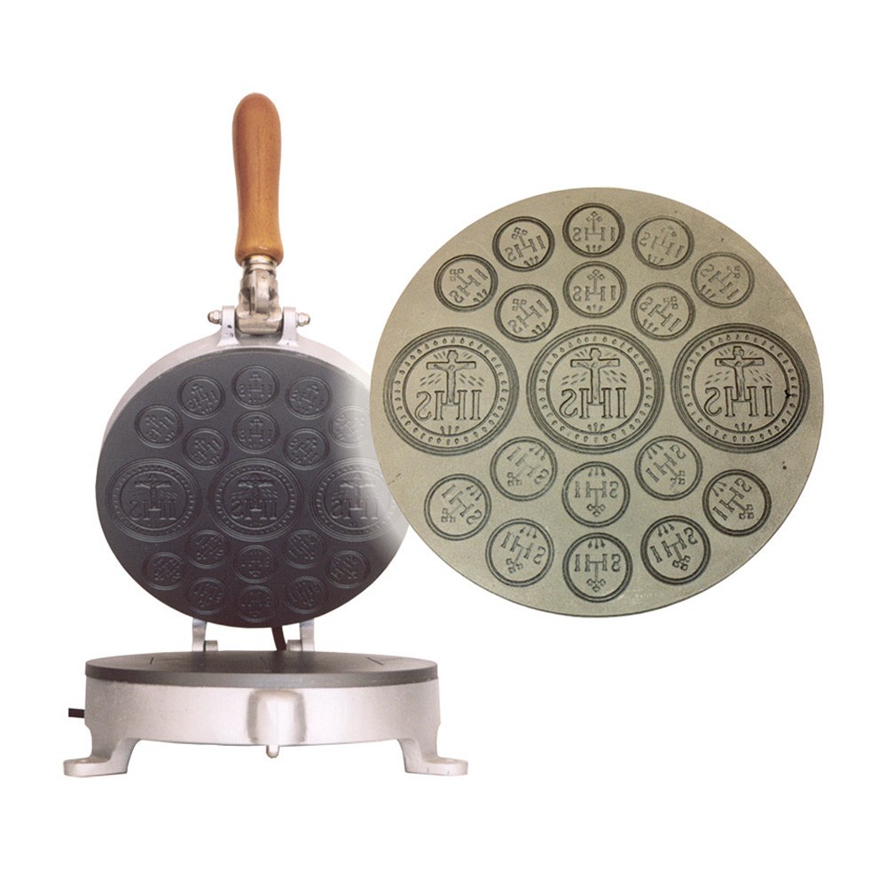 Questo stampo per la produzione di ostie sacre è di tipo medio, da 1.300 watt con alimentazione a 220 volt. Per ogni cialda si ottengono 3 ostie grandi da (7,5 cm ) e 16 particole di ottima qualità.