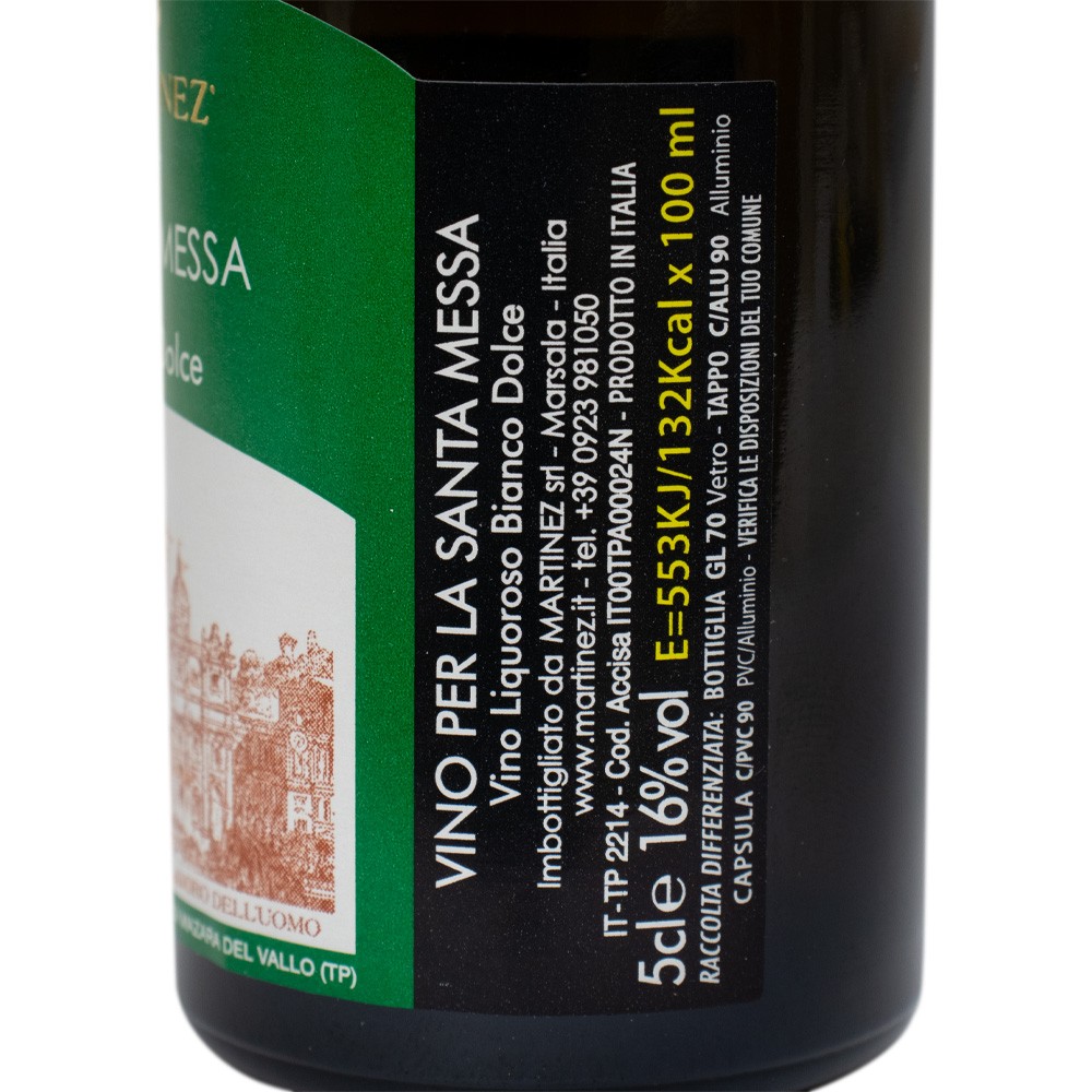 Vino bianco liquoroso dolce da 5 cl per la celebrazione liturgica della santa messa, prodotto dall'azienda Martinez.