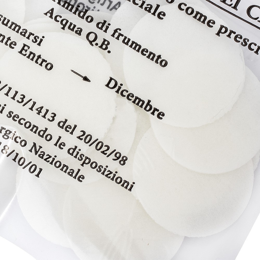 Queste particole bianche sottili dal diametro 3,5 cm sono prodotte in Italia nel rispetto delle normative liturgiche e alimentari per la massima qualità e sicurezza.