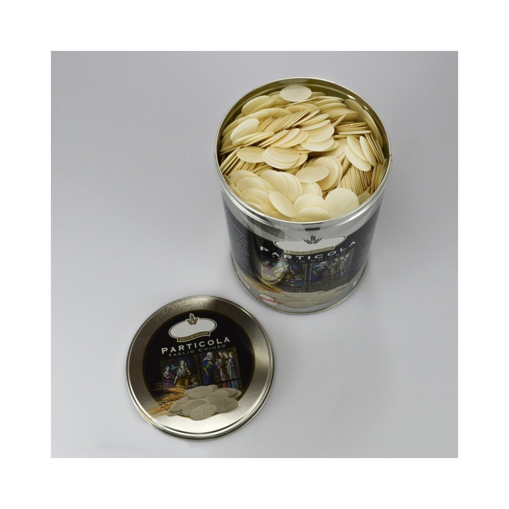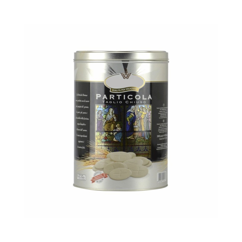Confezione in latta con all'interno 3000 particole con taglio chiuso. Il diametro delle particole è di 3,5 cm, sono particole prodotte per evitare frammenti e sono croccanti.