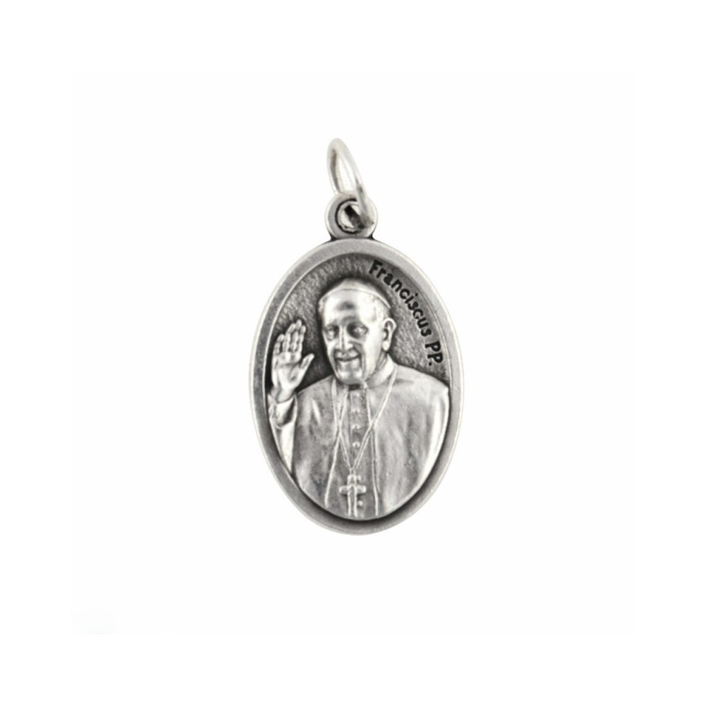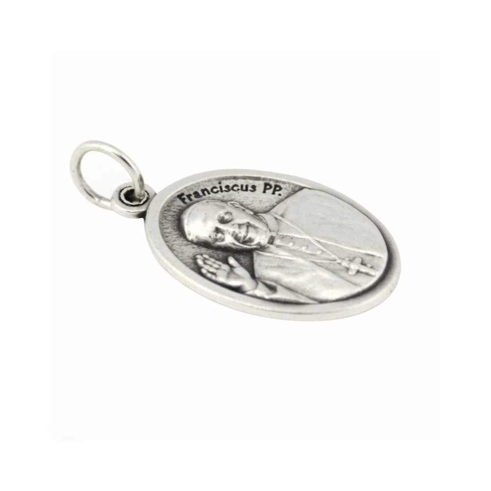 Medaglia ovale in zama argentata con immagine sul fronte di Papa Francesco e sul retro di Maria che Scioglie i Nodi. Prodotto made in Italy.