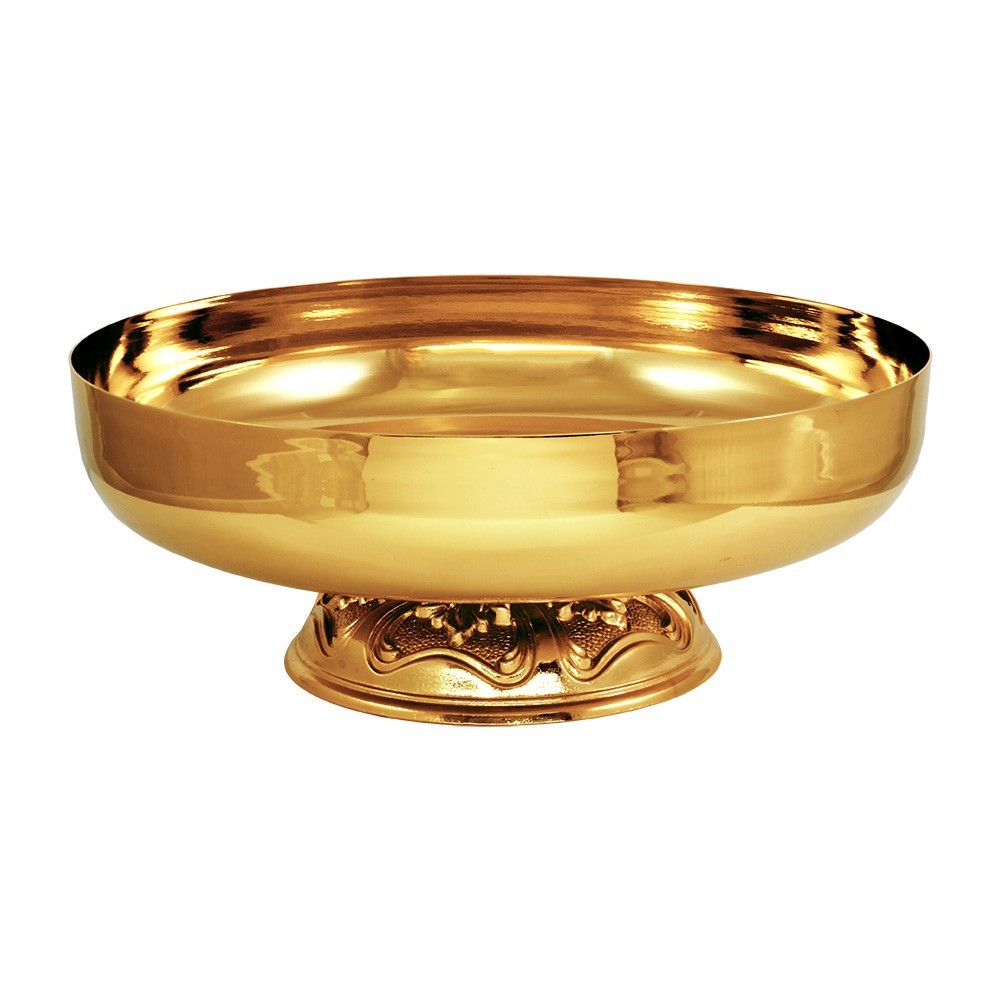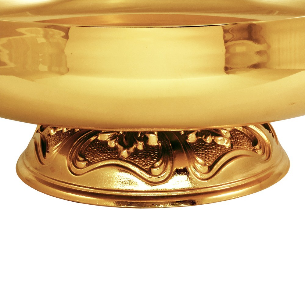 Patena liturgica in ottone dorato. La patena si presenta con base finemente decorata eseguita mediante una particolare tecnica artigianale in fusione.