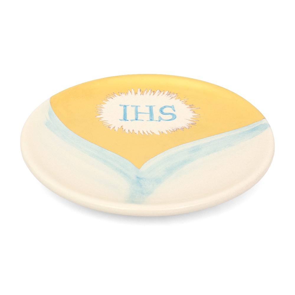 Patena liturgica realizzata interamente in ceramica bianca e oro decoro JHS.