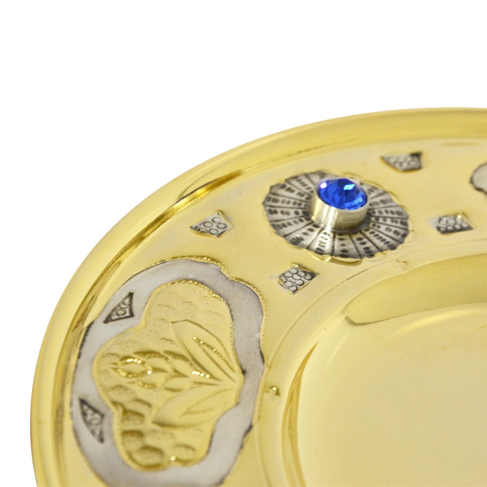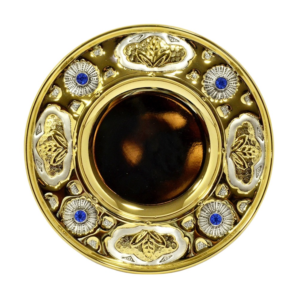 Patena cesellata a mano in ottone bicolore con applicazione di pietre._