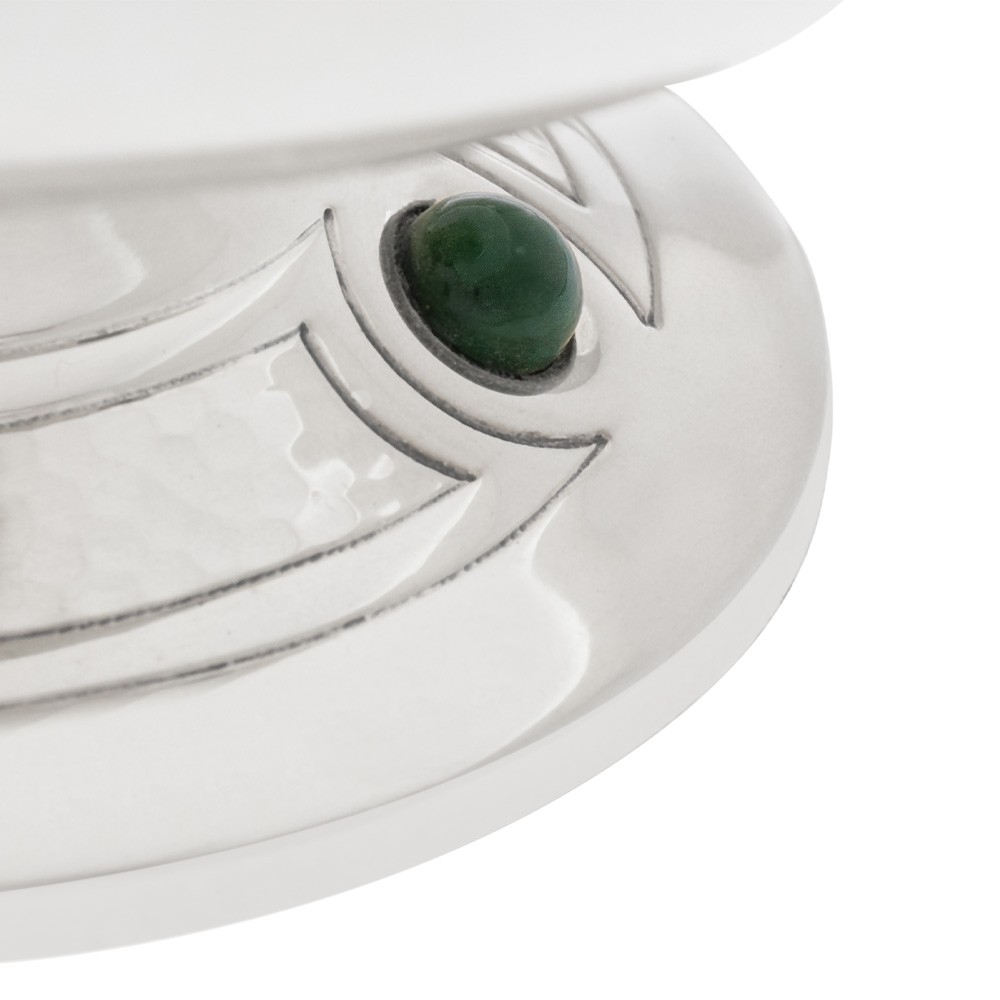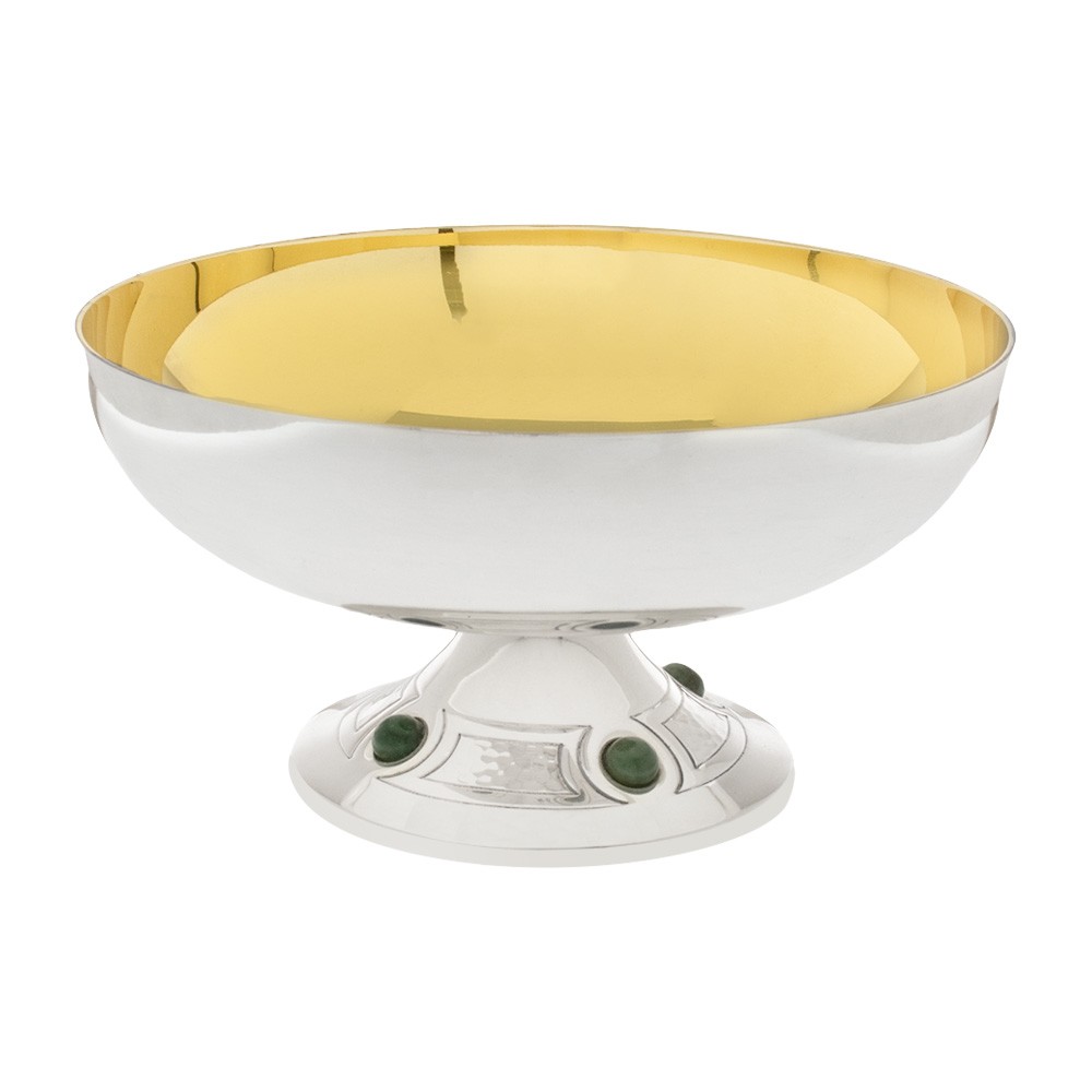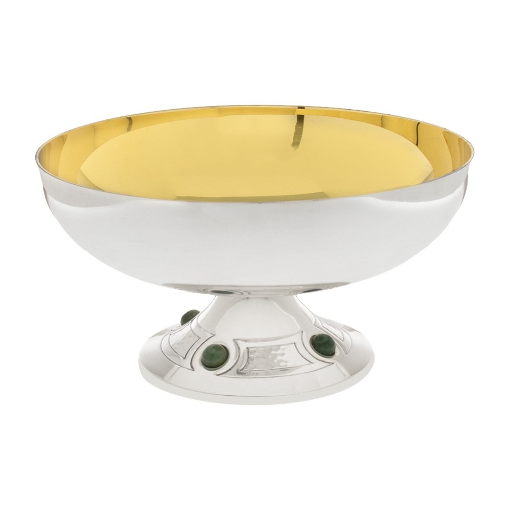 Patena offertoriale di manifattura spagnola "Luis Molina". Realizzata in ottone argentato e l'interno della coppa è in ottone dorato, impreziosita con pietre naturali di colore verde poste sulla sulla base. Articolo di particolare bellezza grazie alla lavorazione curata nei dettagli e al bagno di argento fatto in modo tale che la sua lucentezza duri nel tempo. Corredato di elegante custodia.