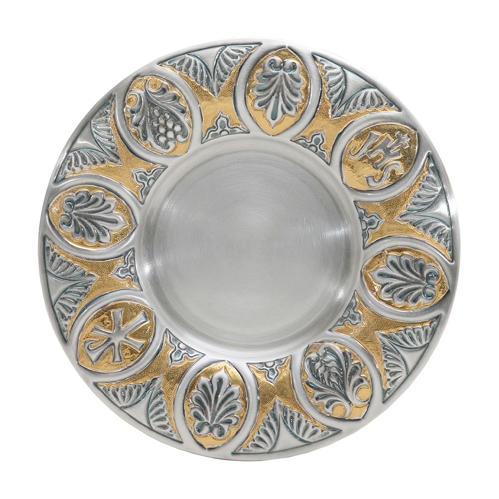 Patena in metallo finemente cesellata. Materiale ottone con finiture oro e argento. Il diametro della patena è 18,5 cm.