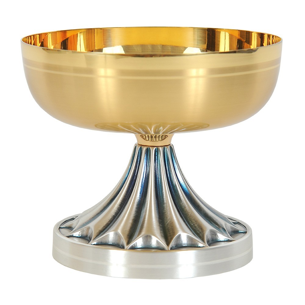 Patena offertoriale in ottone bicolore. La coppa è liscia in ottone dorato e la basa è lavorata in ottone argentata. La patena misura 14 cm di diametro ed è alta 11 cm. Questo articolo liturgico è realizzato da un'azienda italiana.