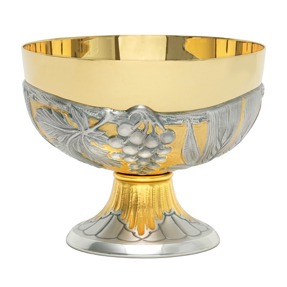 Patena eucaristica offertoriale in ottone cesellata. La patena offertoriale è in ottone bicolore con finiture argento e dorate. L'altezza della patena è 11 cm e il diametro della coppa è 14 cm.
