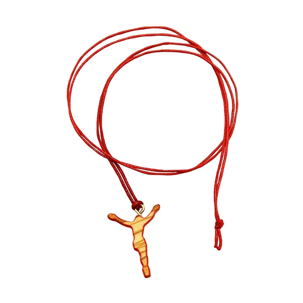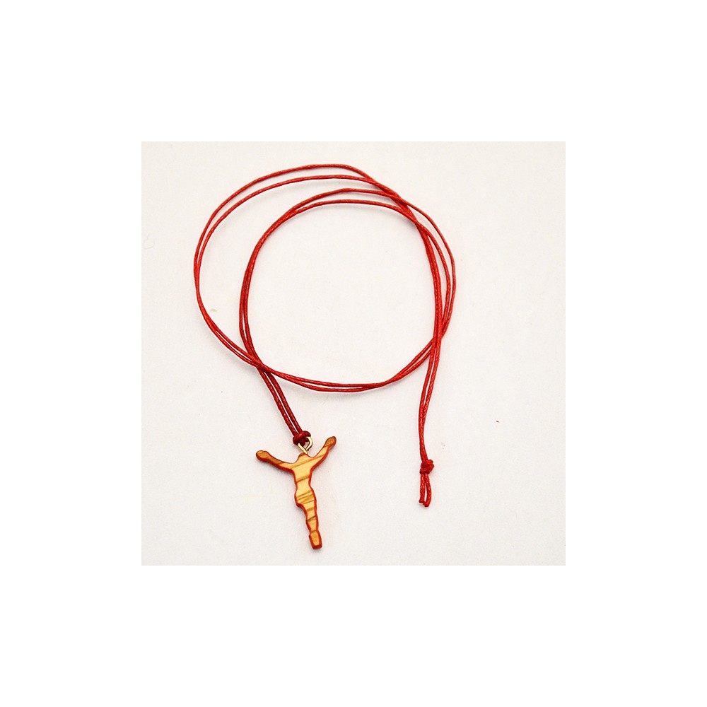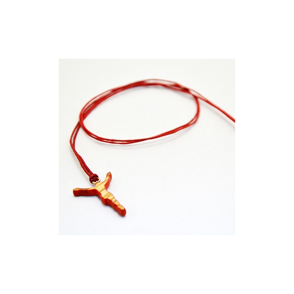 Croce da collo stilizzata, con cordino (collana) a colore. La croce è dello stesso materiale delle croci Tau, legno di ulivo, è colorata lungo i bordi. Ideale come regalo per ragazzi. Imbustata.