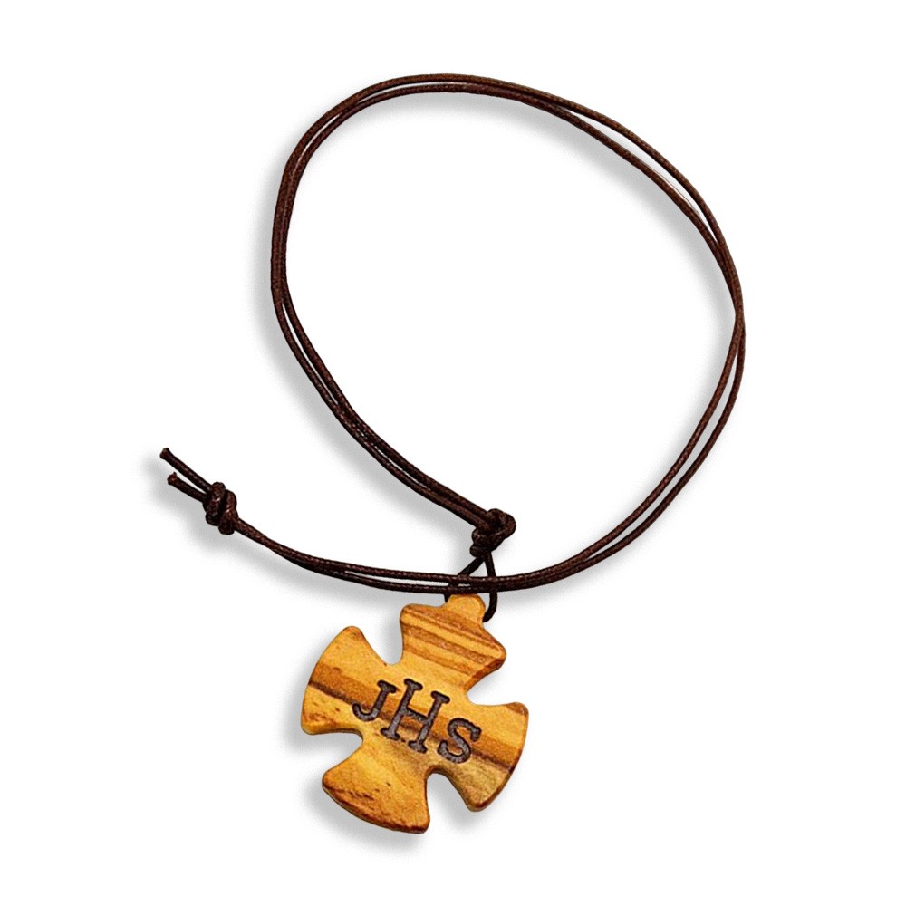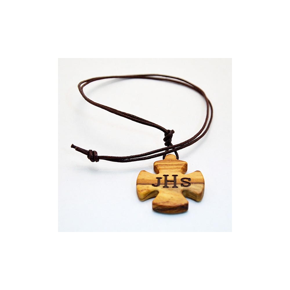 Croce da collo stilizzata, con cordino (collana) marrone. La croce è dello stesso materiale delle croci Tau, legno di ulivo, è incisa con iniziali JHS. Ideale come regalo per ragazzi e anche per prime comunioni, cresime e confessioni.