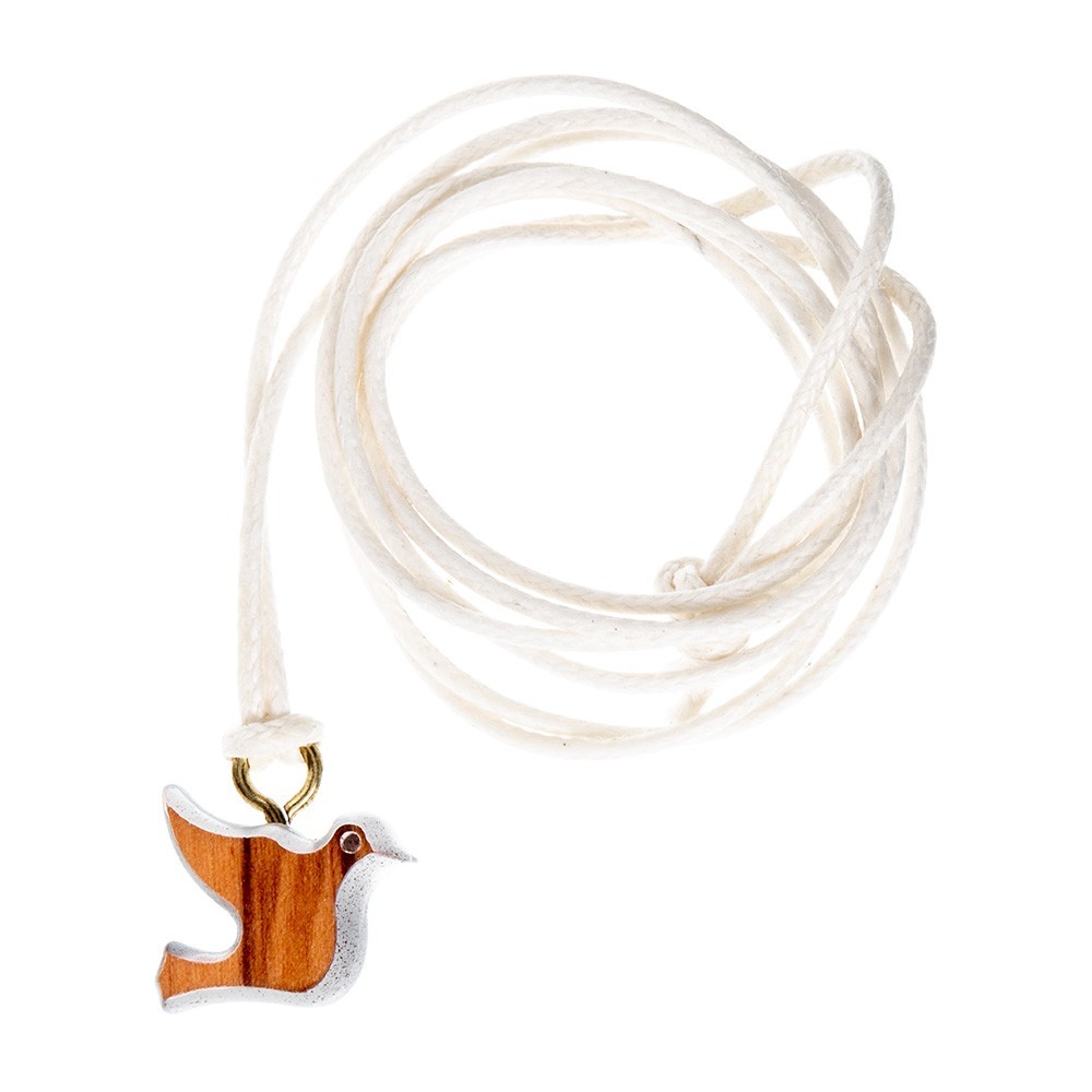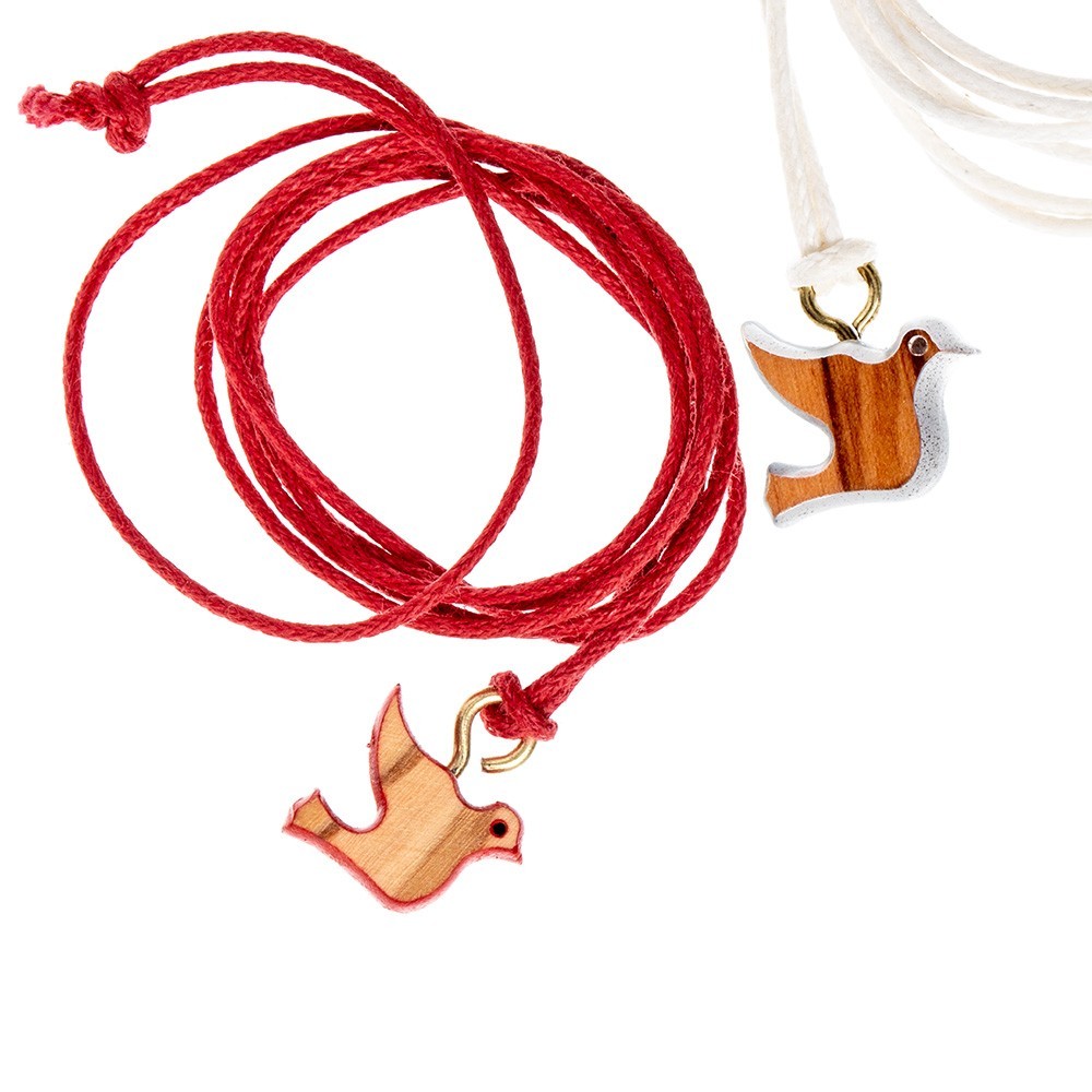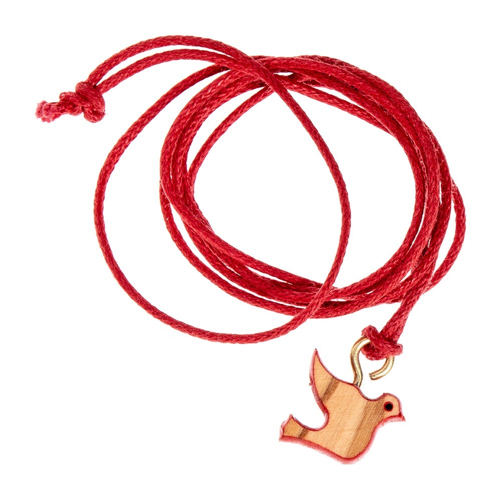 Pendente in legno di ulivo con cordoncino di colore rosso. Il ciondolo è a forma di colomba simbolo dello Spirito Santo. Ideale come e ricordino per il sacramento della Cresima-Confermazione. Prodotto made in Italy.