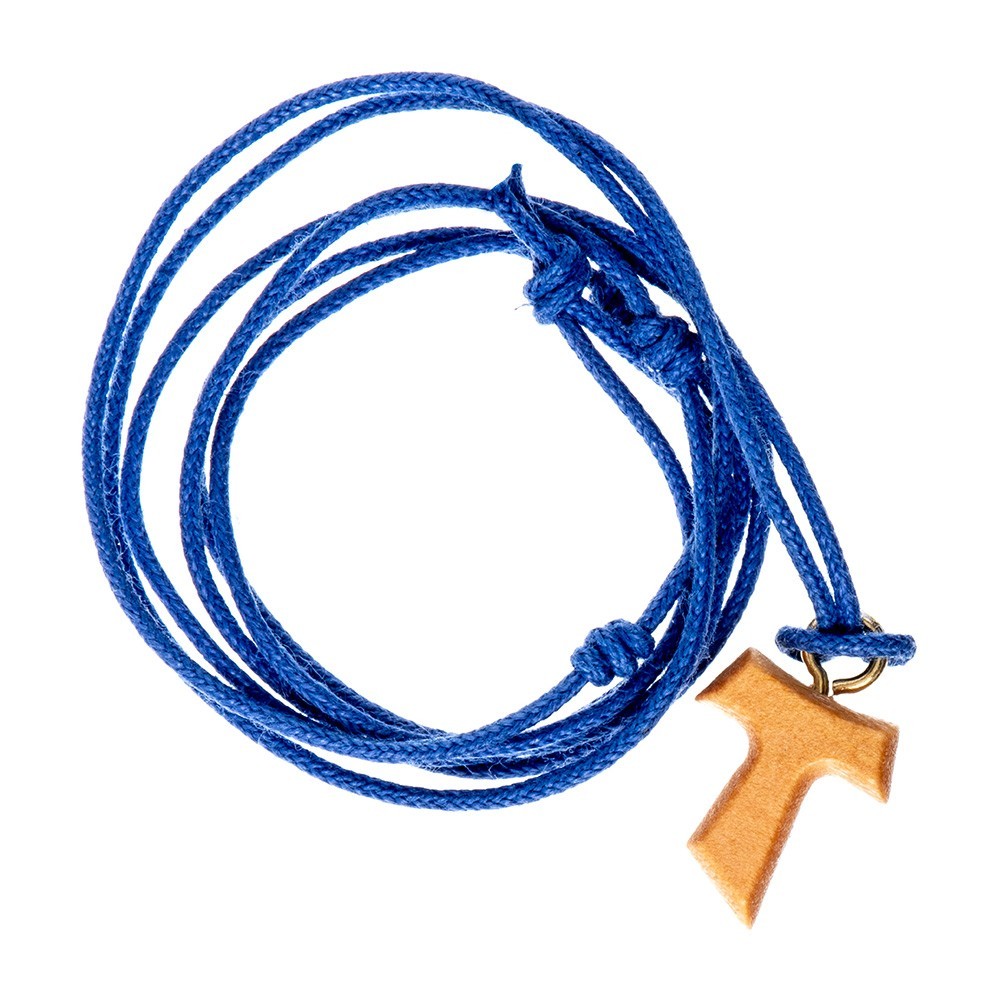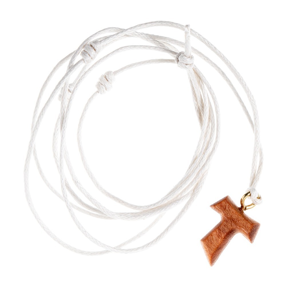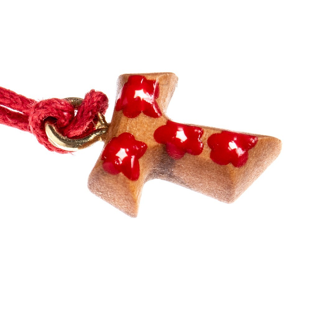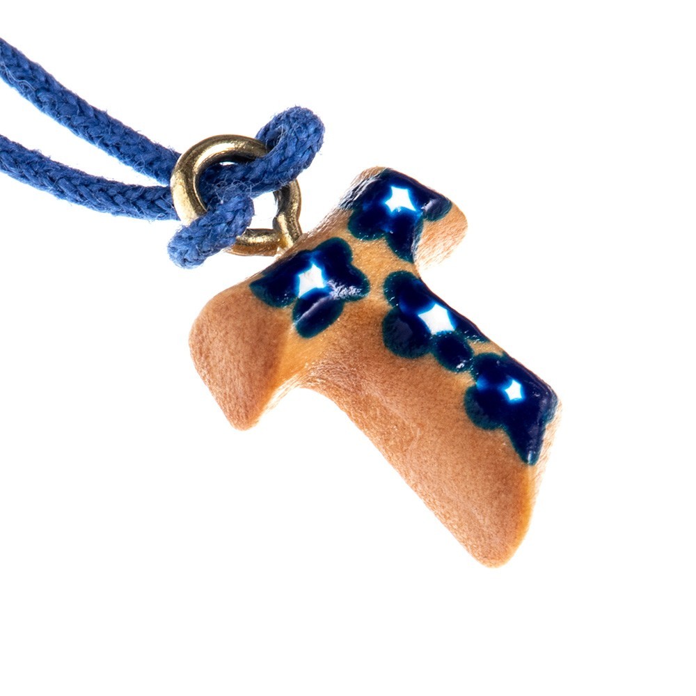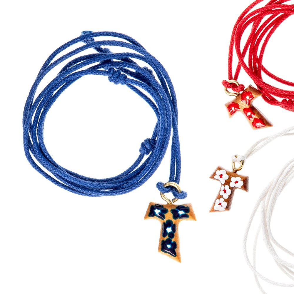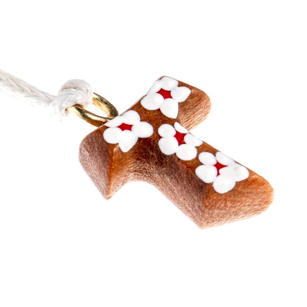 Croce Tau decorato con fiorellini dipinti a smalto, in legno di ulivo, la croce dei poveri diffusa da San Francesco d'Assisi. Corredata di un laccio in corda (collana) a colore. Ideale come regalo per ragazzi e anche per Prima Comunione, Cresima e Confessione.