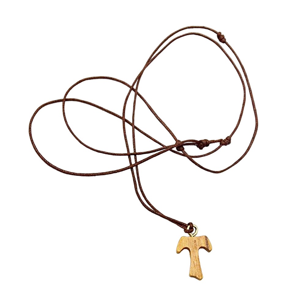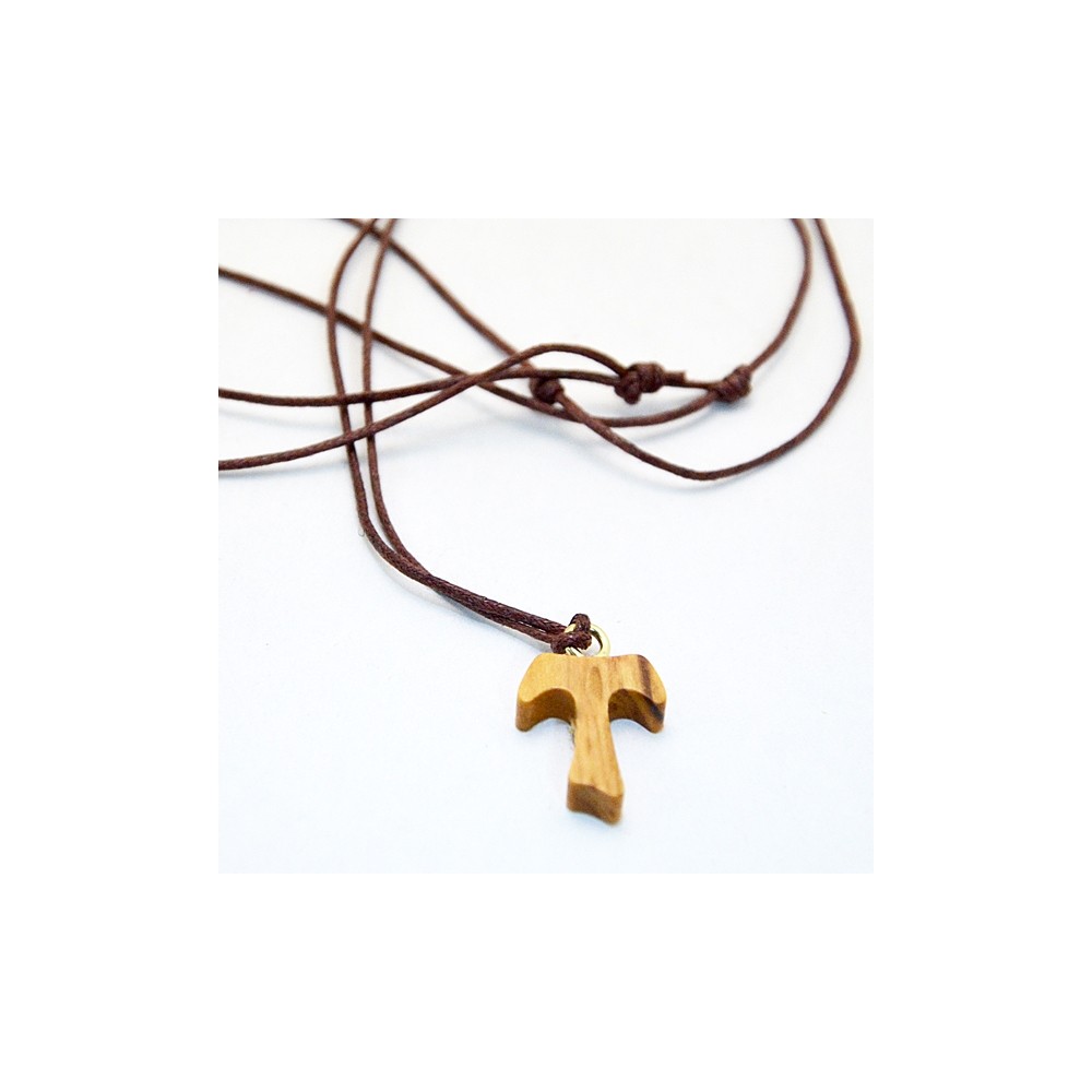 Croce Tau in legno di ulivo. La croce dei poveri diffusa da San Francesco d'Assisi è corredata di collana in corda. Ideale come regalo e come ricordino per i sacramenti della Comunione, Cresima e Confessione.