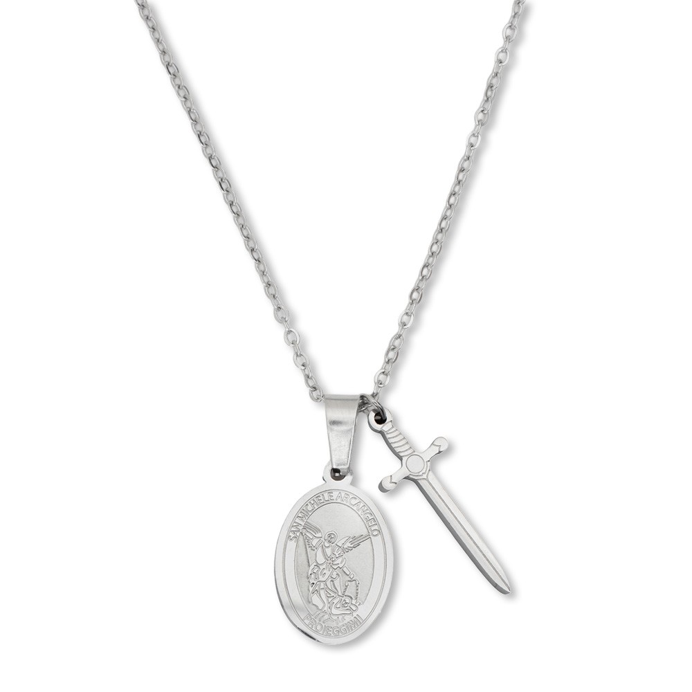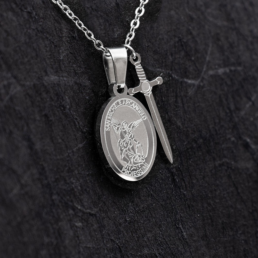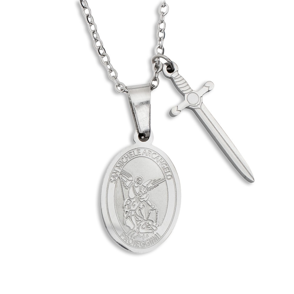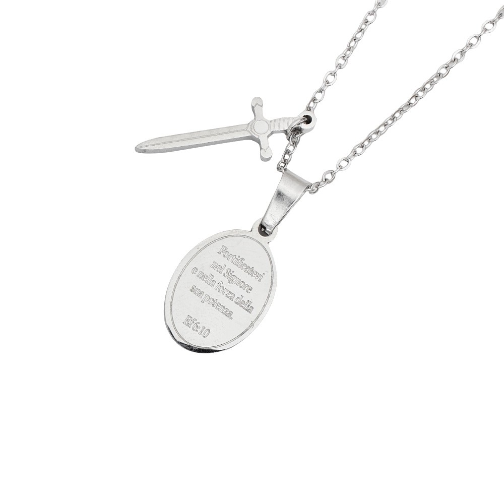 Collana con Medaglia pendente di San Michele e spada. La medaglietta e la catenina sono in acciaio inox completa di gancio per l'apertura.
