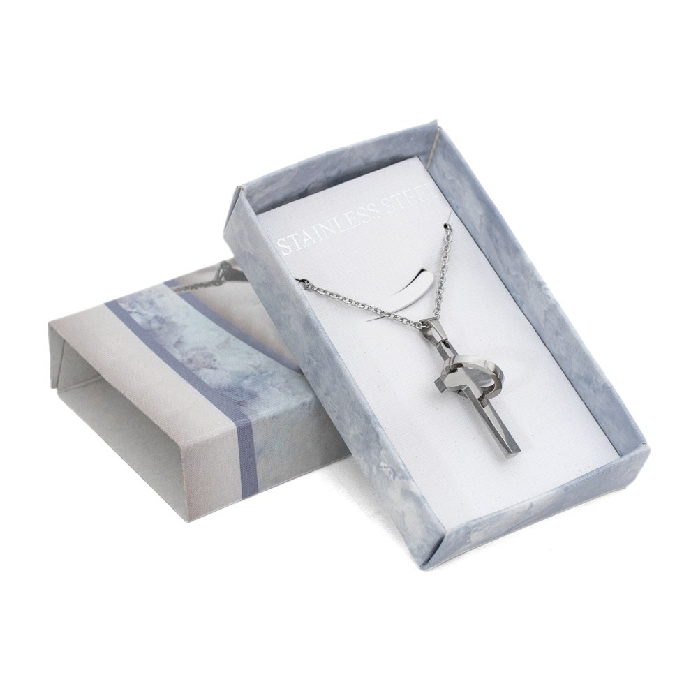 Confezione a cassetto con collanina croce e cerchio in acciaio inox.