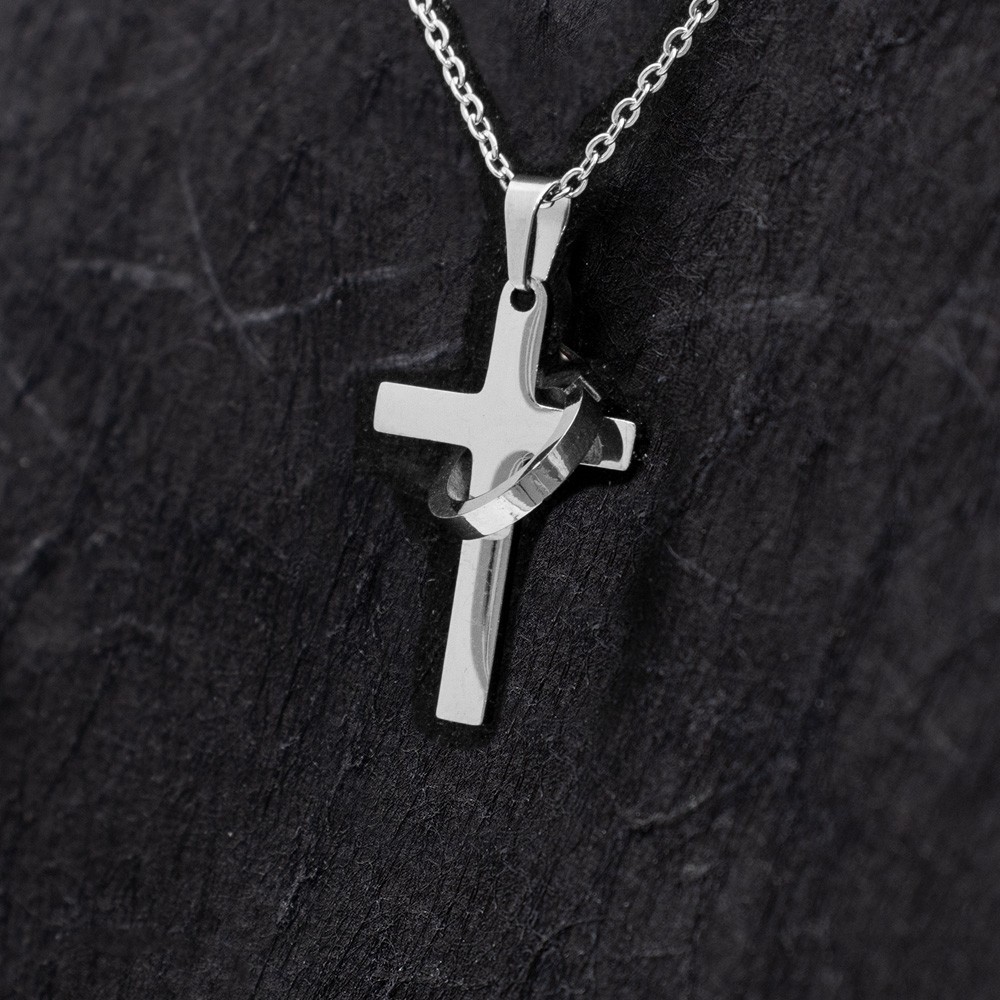 Collana e ciondolo con croce e cerchio interamente in acciaio inox. La collanina è completa di gancio per l'apertura.