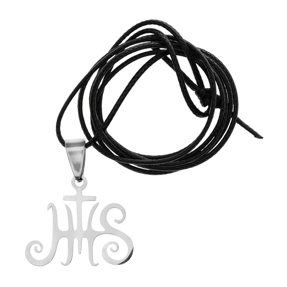 Piccolo pendente in acciaio simbolo JHS, completo di leccetto e foglietto illustrativo.