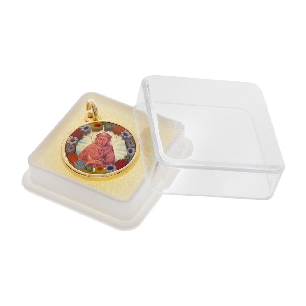 Medaglietta di San Francesco realizzata in vetro di murano e montatura in metallo dorata.