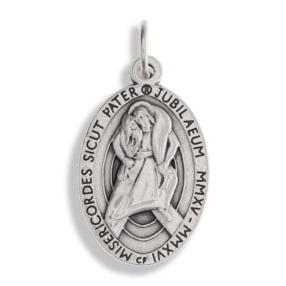 Medaglia ovale in metallo color argento raffigurante da un lato Papa Francesco e dall'altro lato il logo del Giubileo.