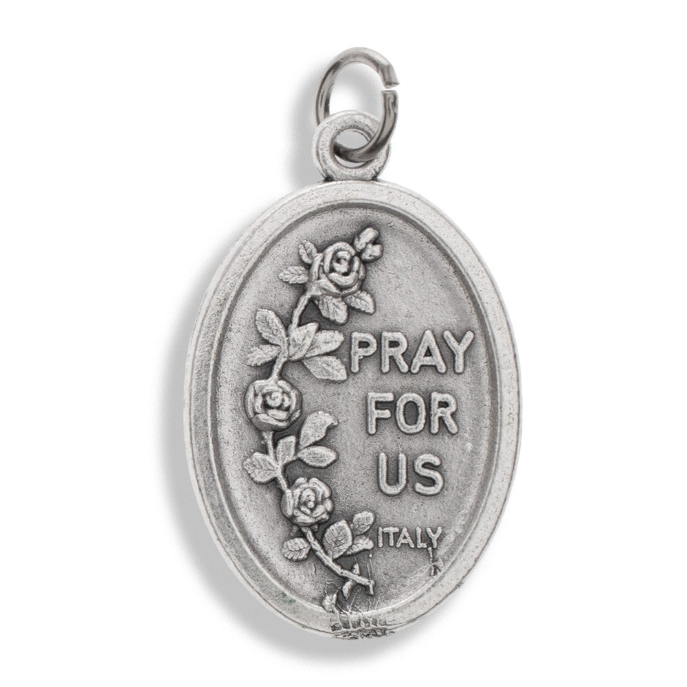 Medaglietta ovale di Santa Teresa realizzata in metallo argento ossidato, sul fronte vi è raffigurata la Santa, mentre sul retro vi è incisa la scritta " PRAY FOR US".