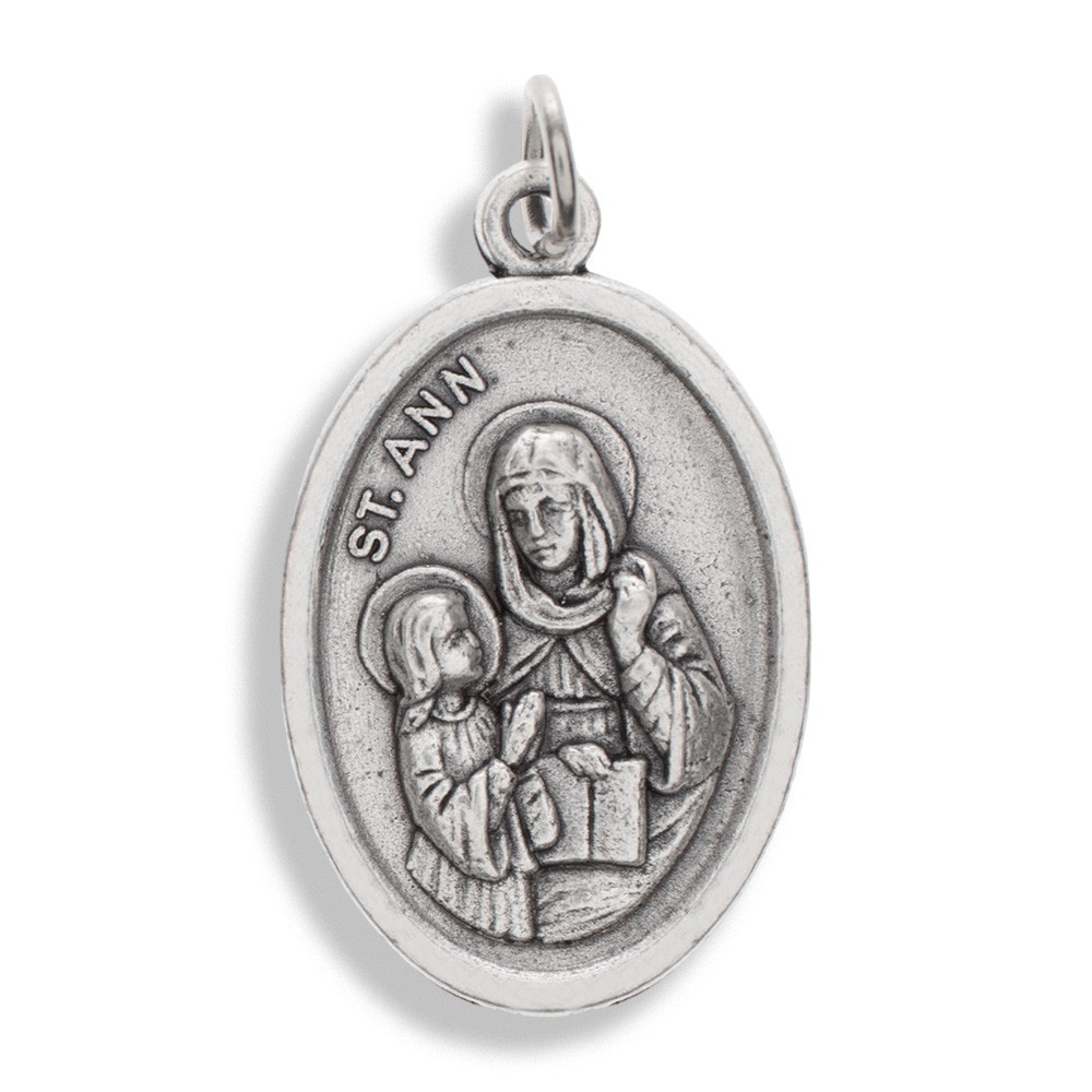 Medaglietta di Sant'Anna realizzata in metallo argento ossidato, sul fronte vi è raffigurata la Santa, mentre sul retro vi è incisa la scritta " PRAY FOR US".