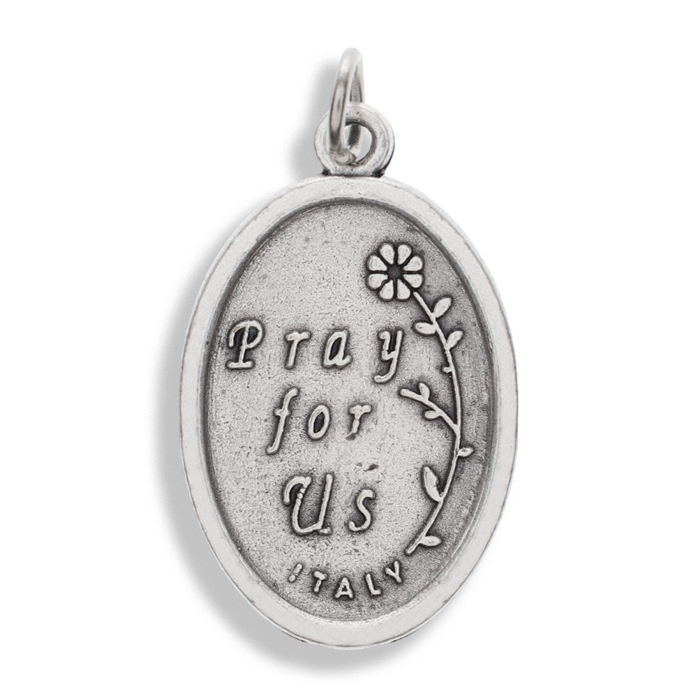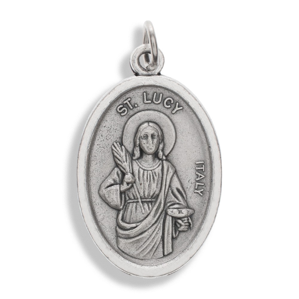 Medaglia di Santa Lucia realizzata in metallo argento ossidato, sul fronte vi è raffigurata la Santa, mentre sul retro vi è incisa la scritta " PRAY FOR US".