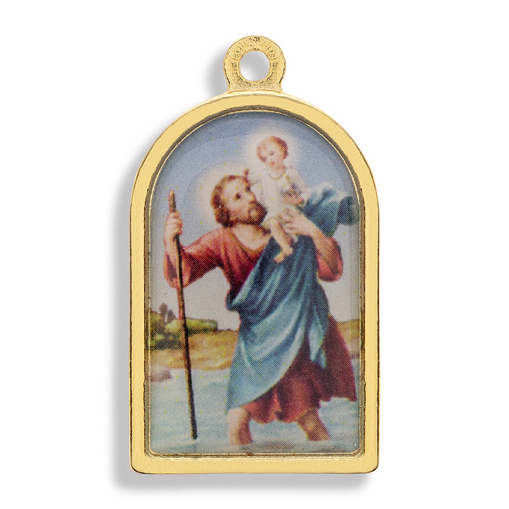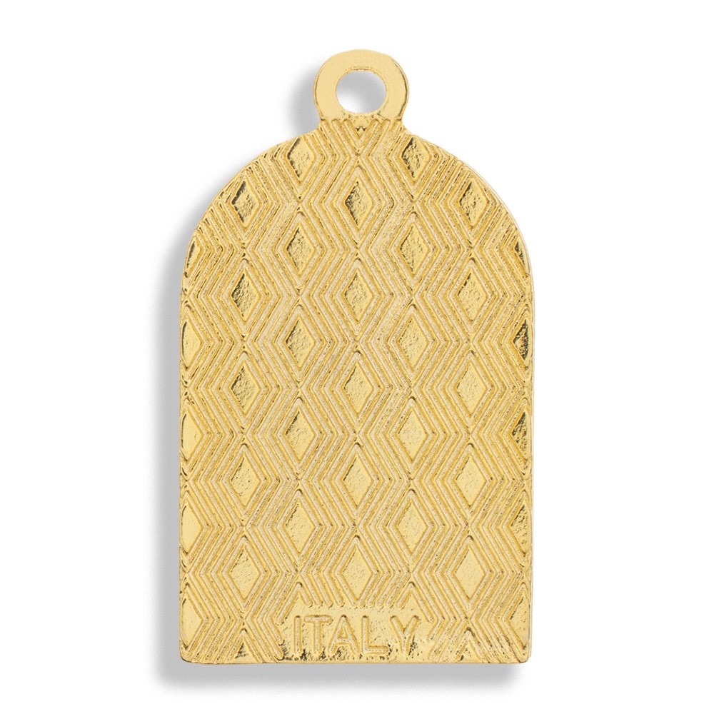 Medaglia di San Giuseppe a forma di cupola, realizzata in metallo dorato e immagine smaltata.