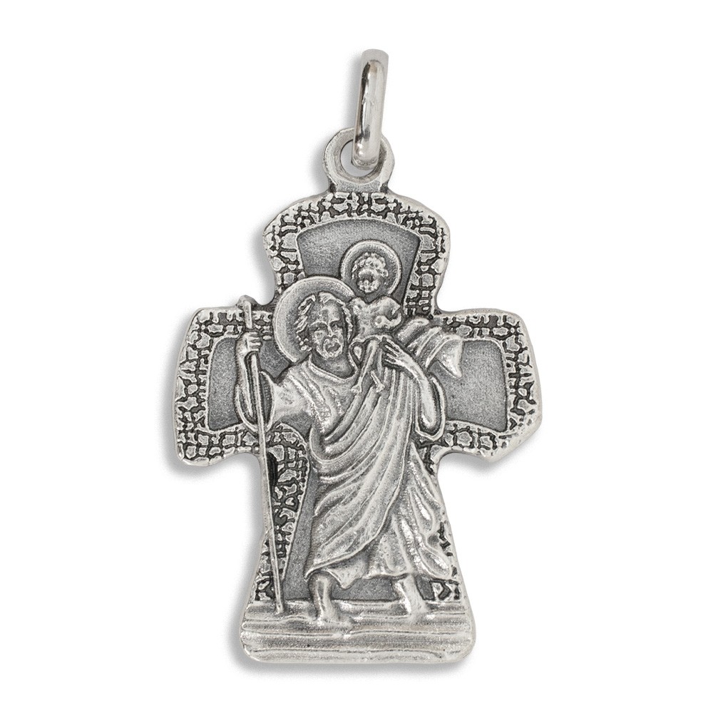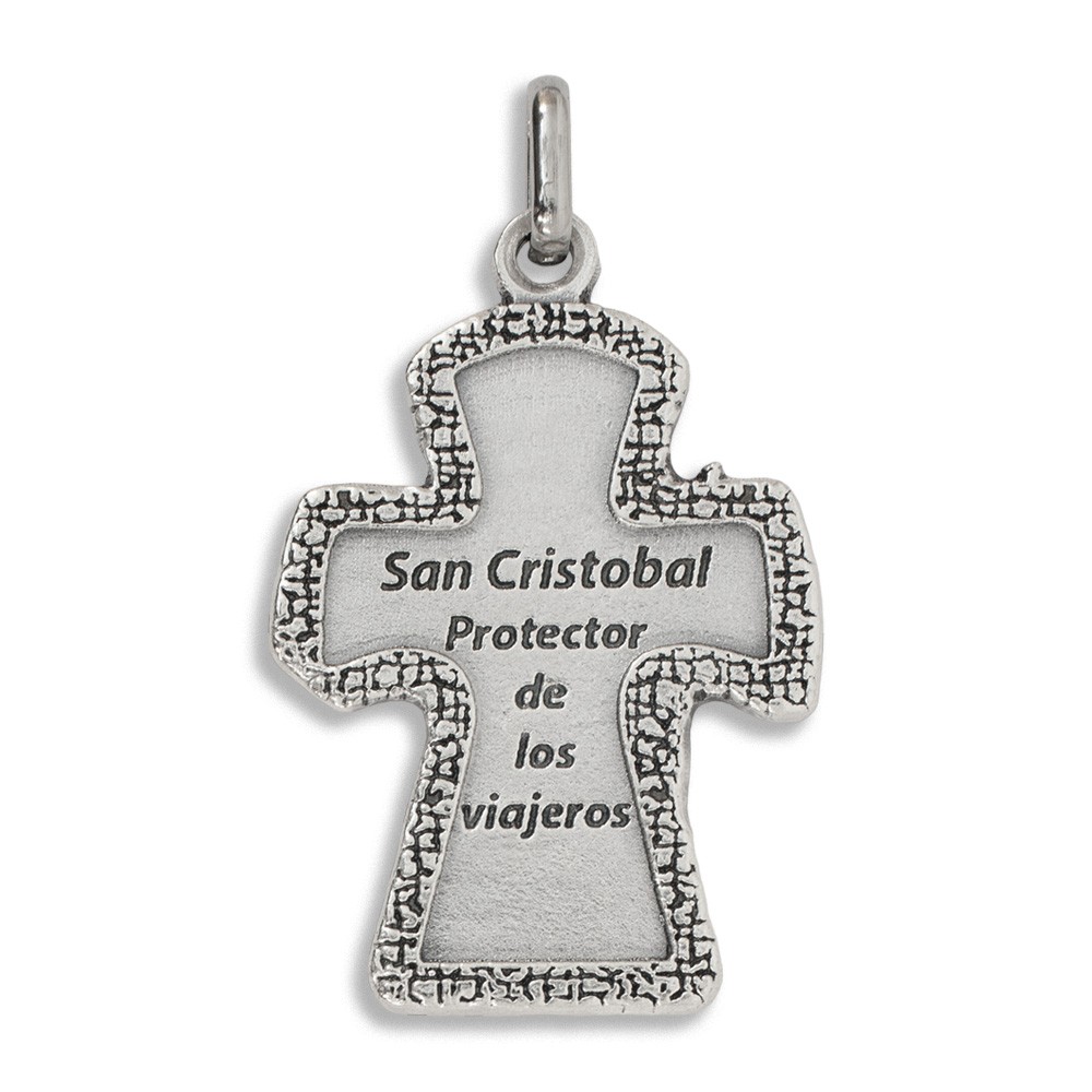 La croce è completa di anellino superiore, misura 3,5x2,6 cm. Su retro vi inciso SAN CRISTOBAL PROTECTOR DE LOS VIAJEROS.