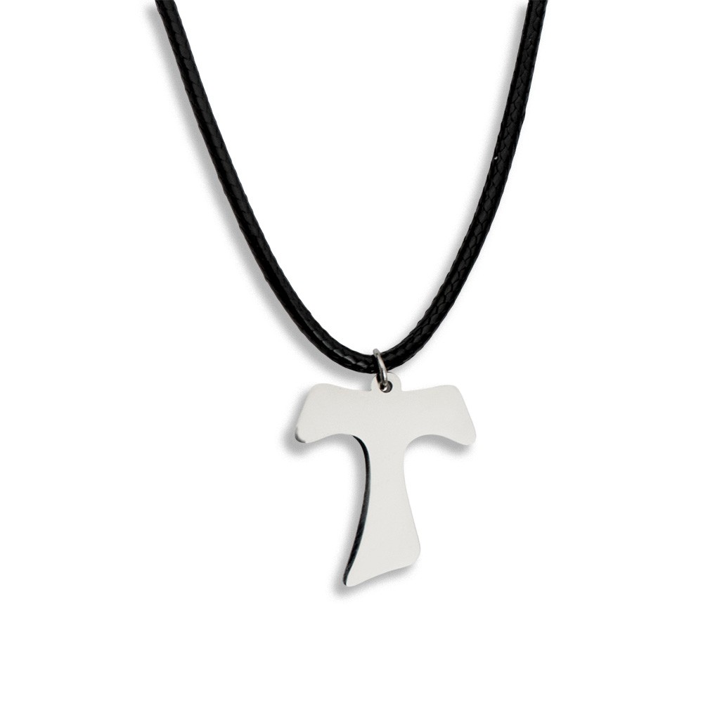 Ciondolo TAU realizzato interamente in acciaio inox con cordino nero da appendere al collo.