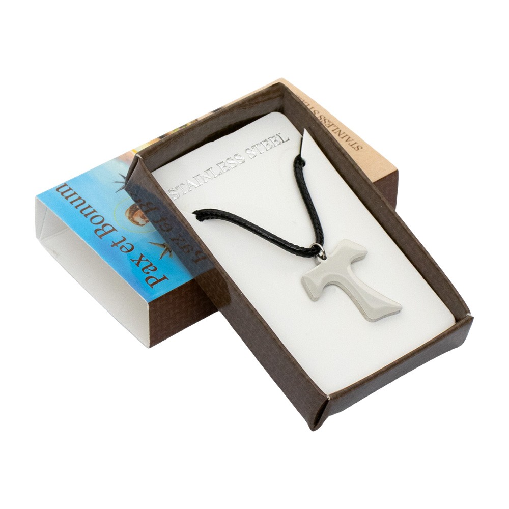Confezione a cassetto con tau e cordino per poterlo appendere al collo.