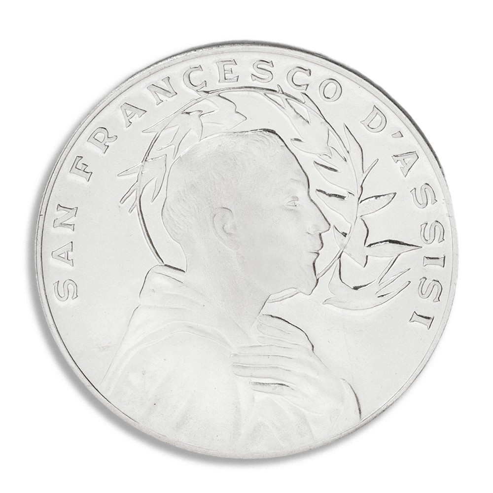 Medaglia moneta di Papa Francesco in metallo argento con raffigurazione sul retro di San Francesco.