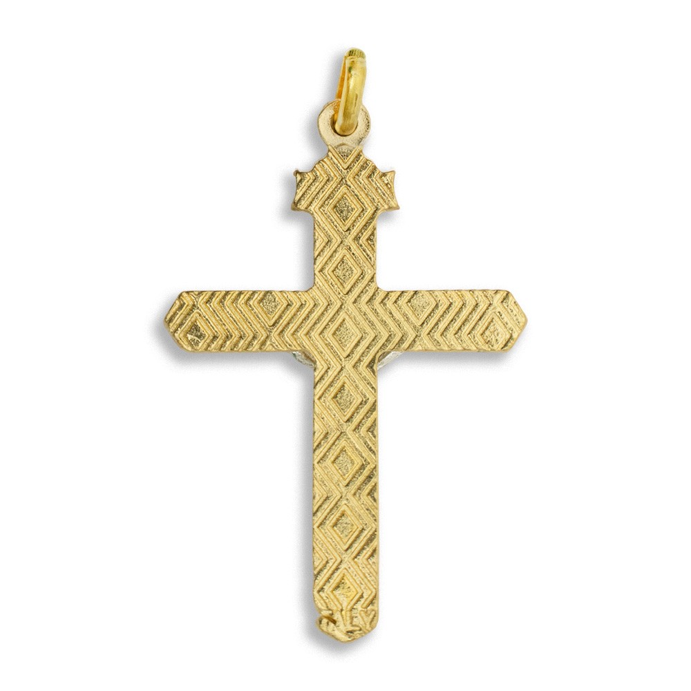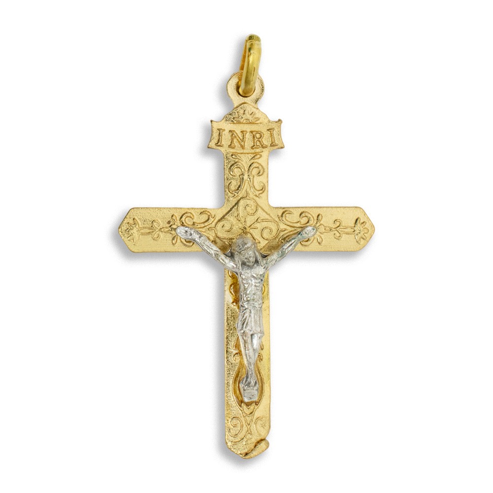 Croce pendente in metallo color oro e Corpo di Cristo color argento, completo di anellino apribile.