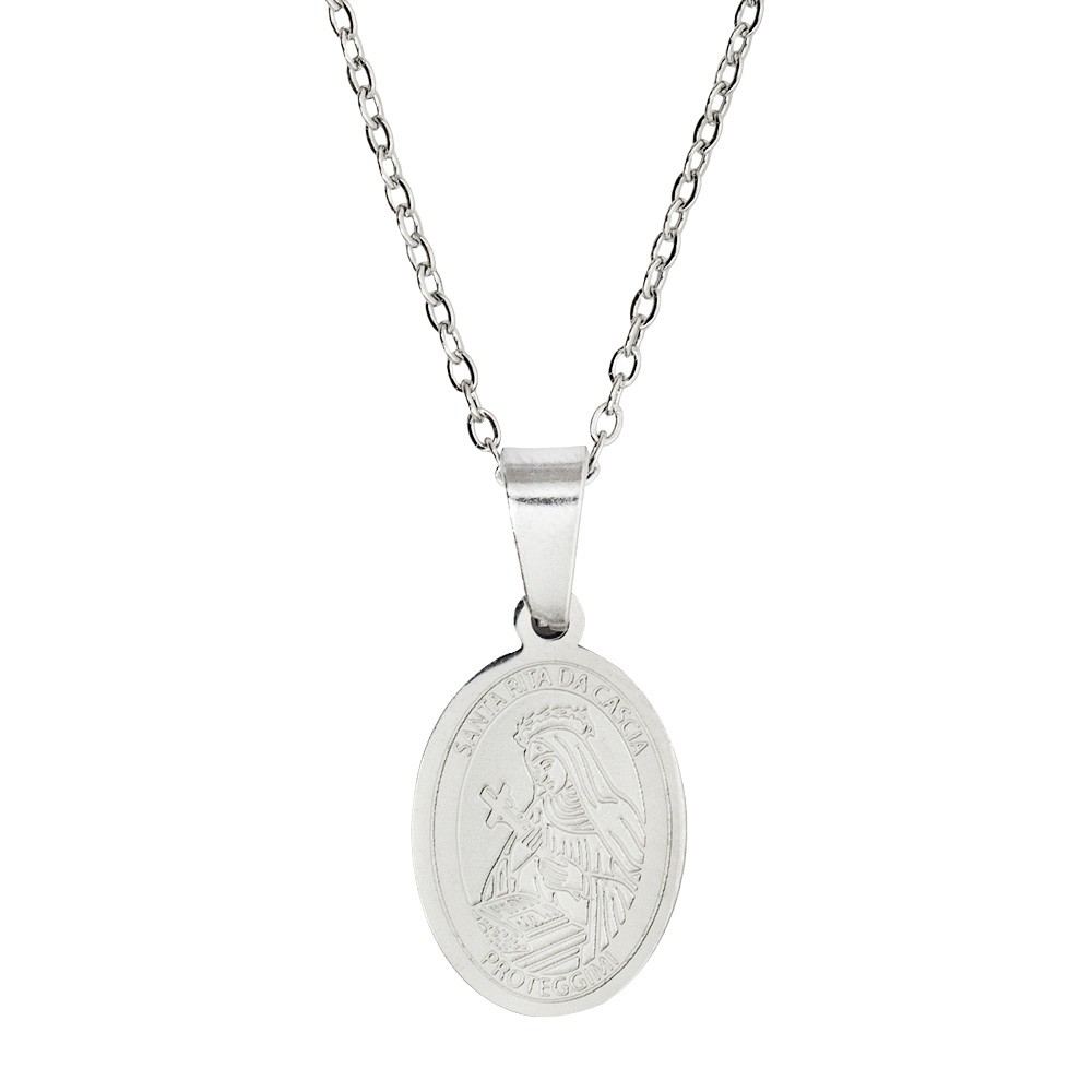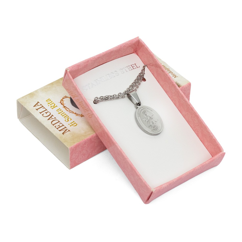 Collana con medaglietta di Santa Rita. La medaglietta e la catenina sono in acciaio inox completa di gancio per l'apertura.