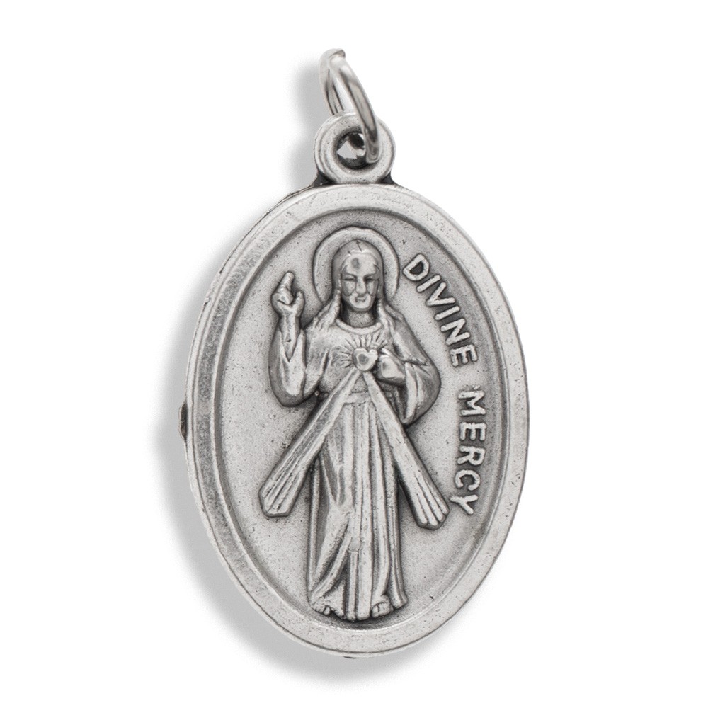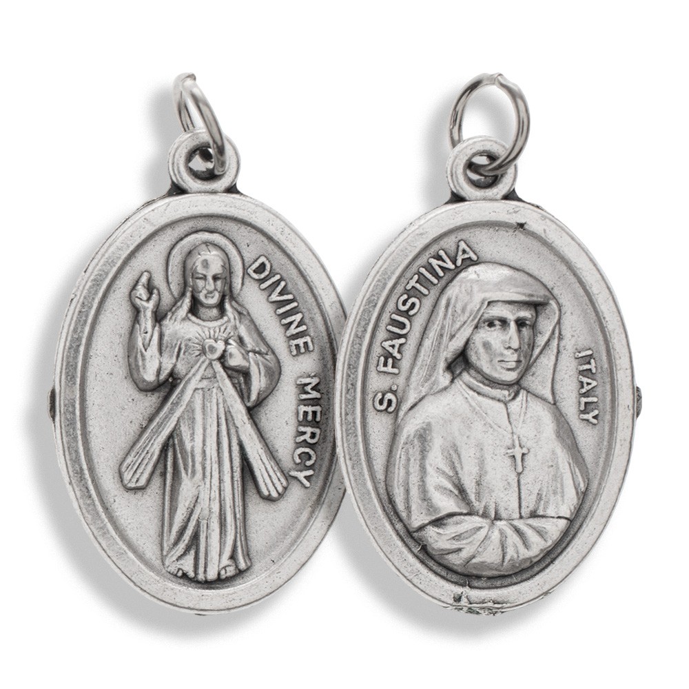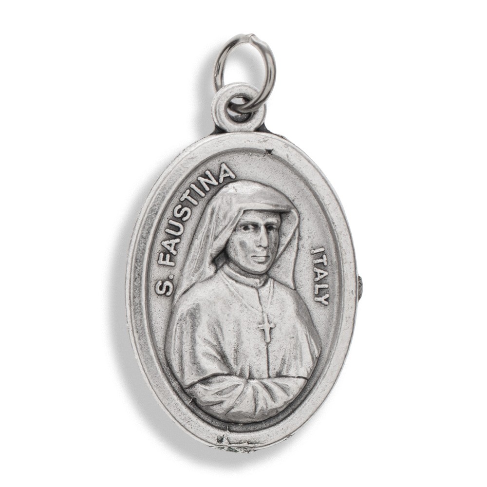 Medaglia ovale in metallo argentato, raffigurante Gesù Misericordioso su un lato e Santa Faustina sull'altro. Dotata di anellino apribile, è perfetta come articolo religioso da portare sempre con sé o da regalare.