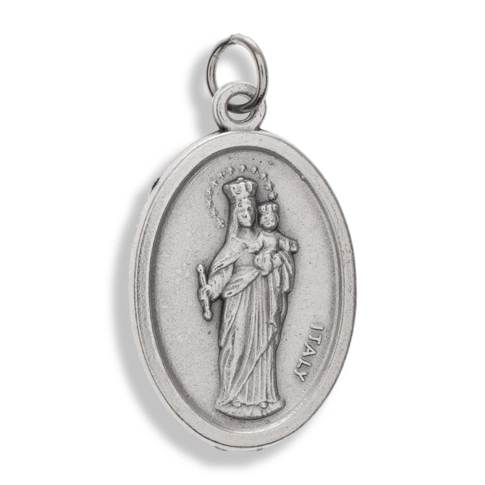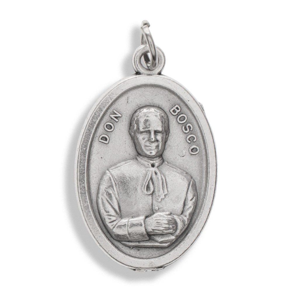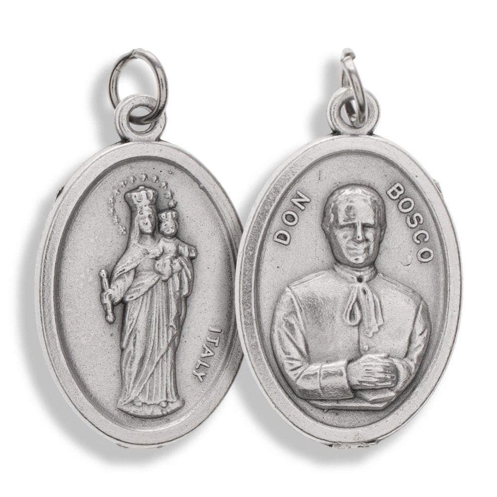 Medaglia ovale in metallo argentato raffigurante la Madonna Ausiliatrice su un lato e Don Bosco sull'altro. Dotata di anellino apribile, è perfetta come articolo religioso da portare sempre con sé o da regalare.