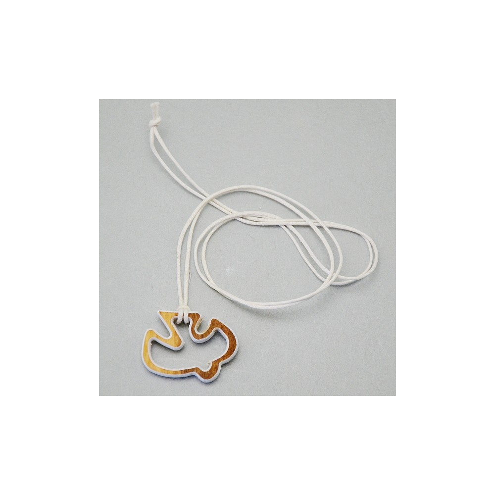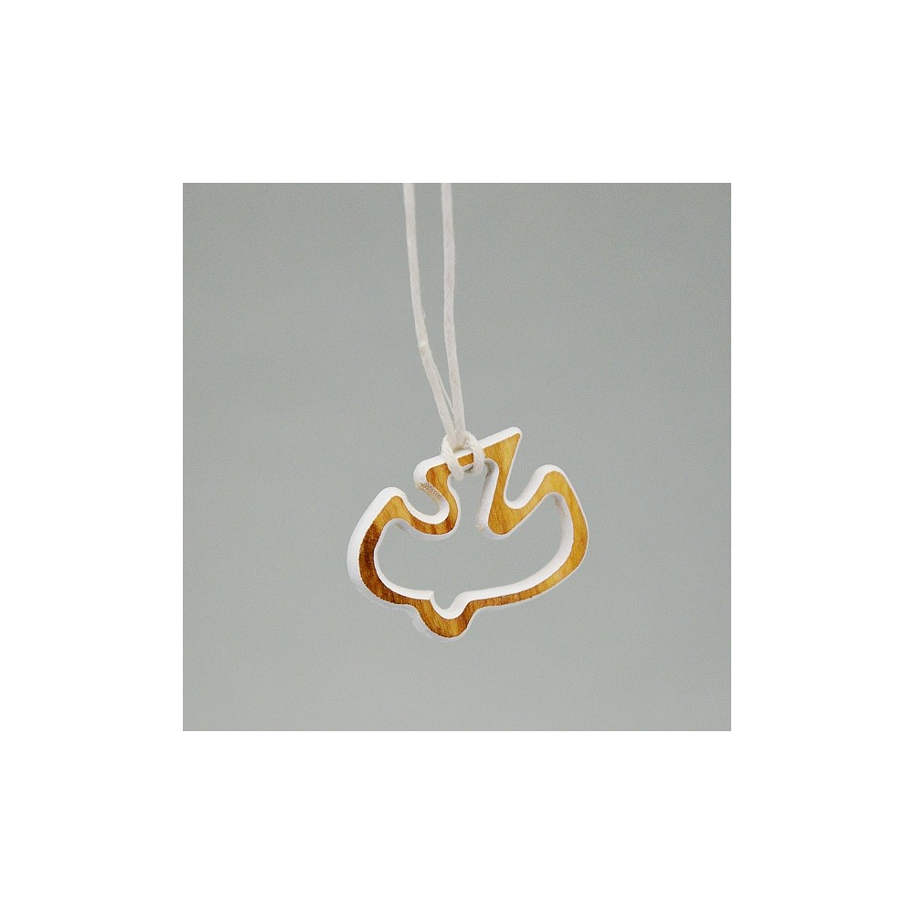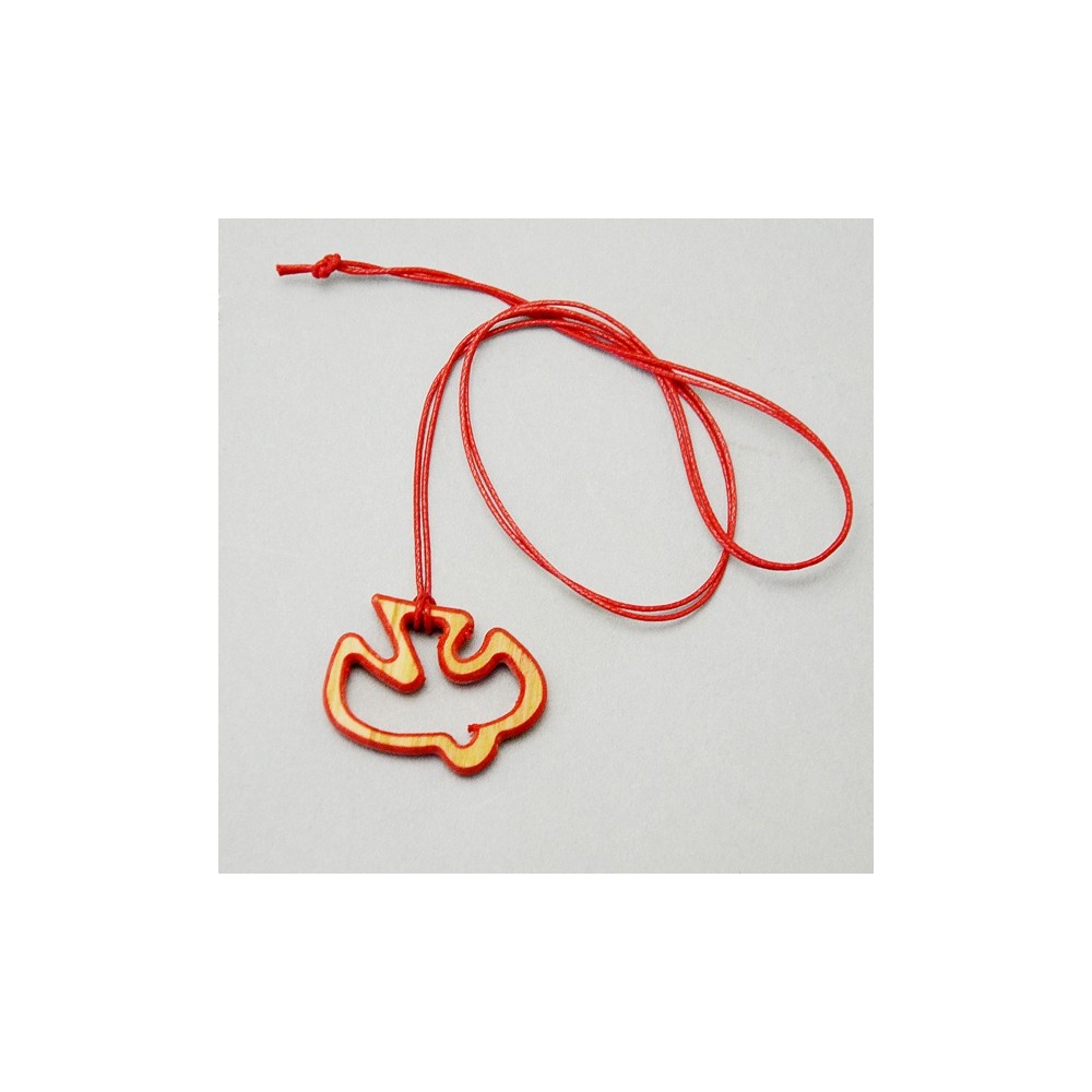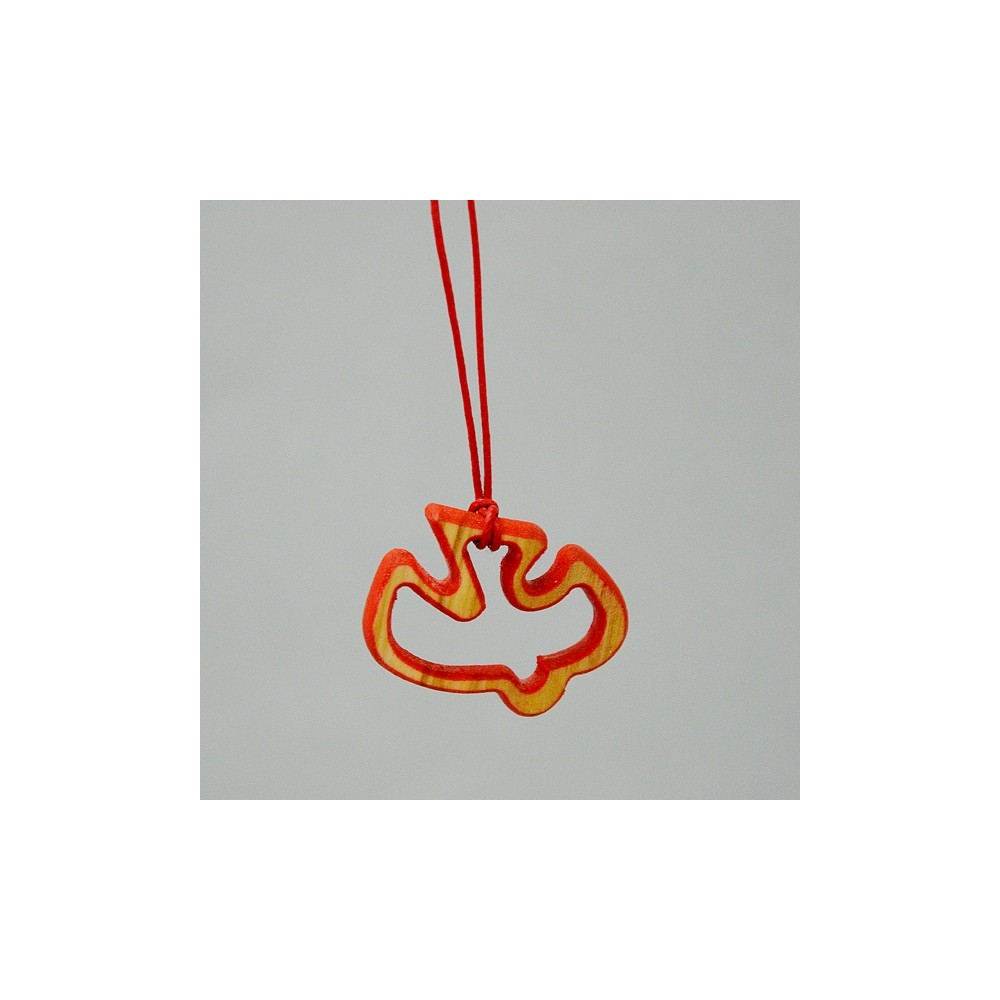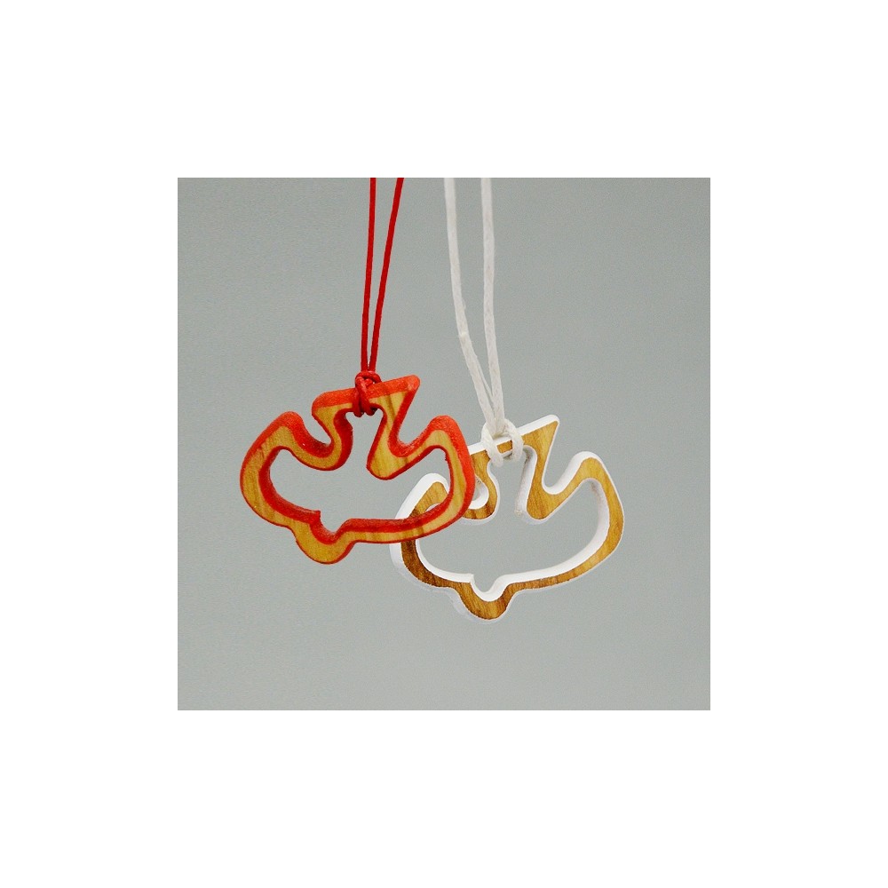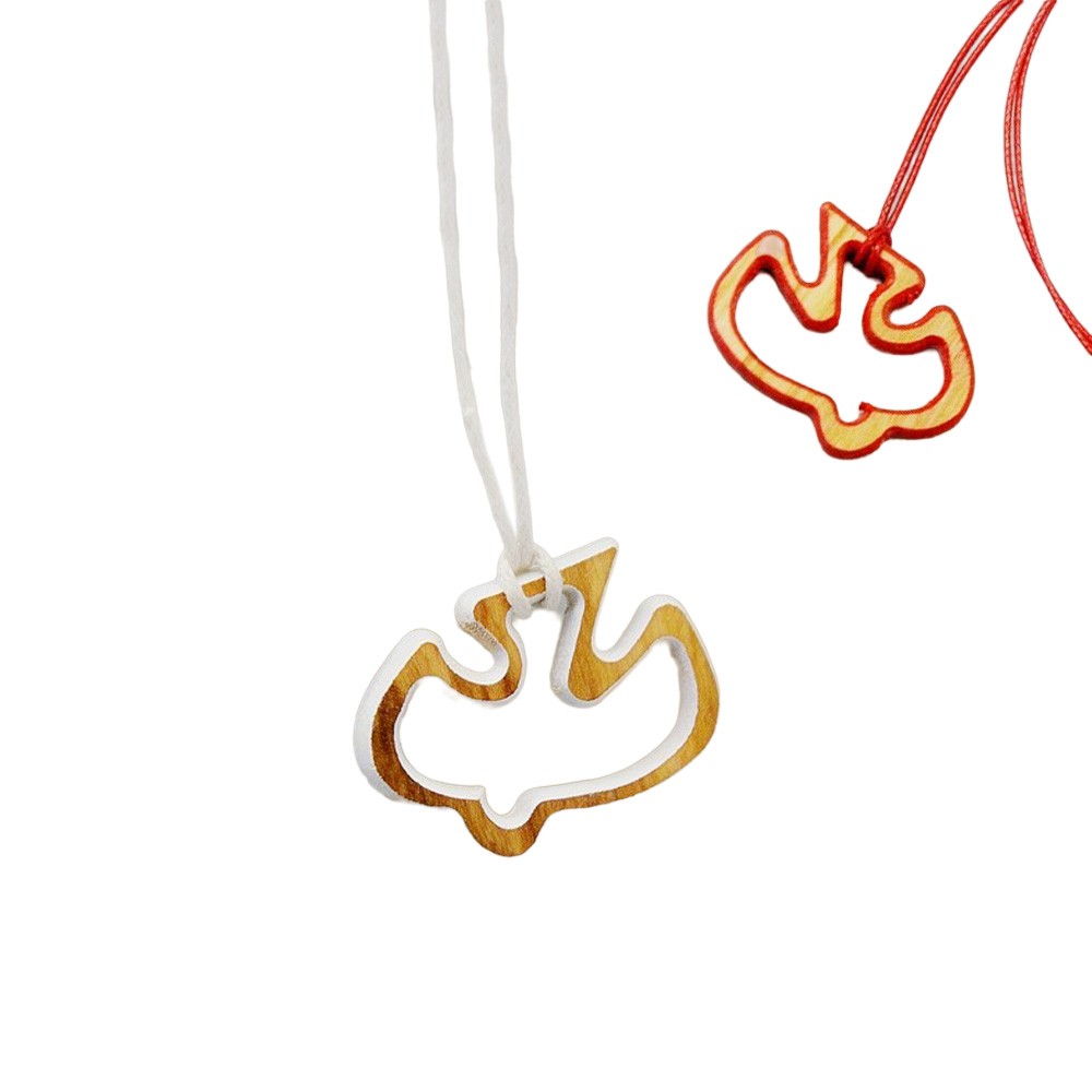 Il pendente con intaglio a forma di colomba è realizzato in legno di ulivo di colore bianco e rosso, con cordino (laccio) abbinato. Ideale come regalo e ricordino per il sacramento della Cresima. Made in Italy.