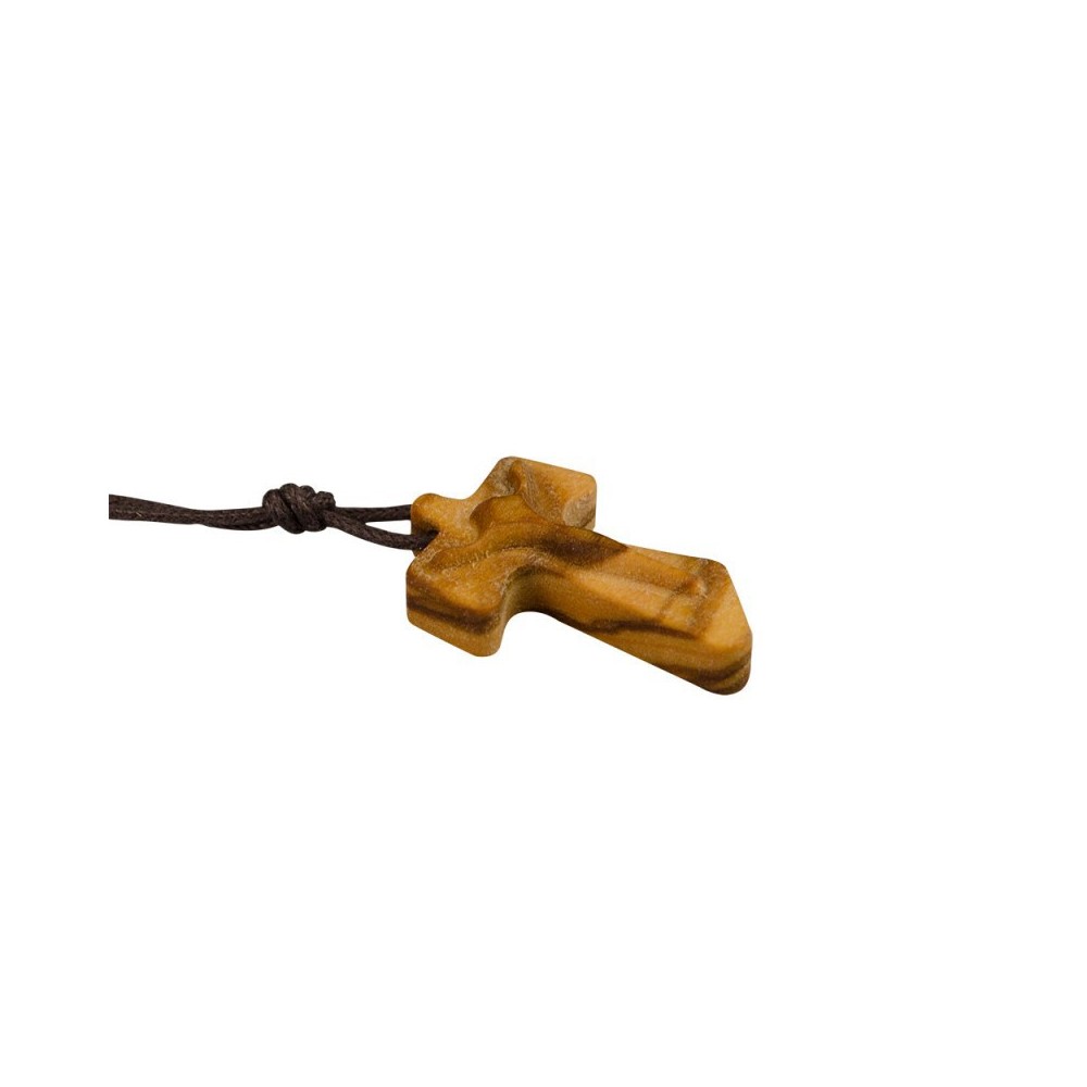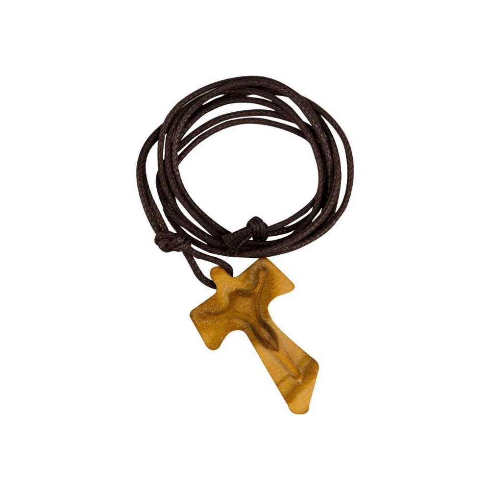Pendente Tau in legno di Ulivo con Cristo Stilizzato in rilievo. Il pendente è corredato di laccetto in corda marrone.
