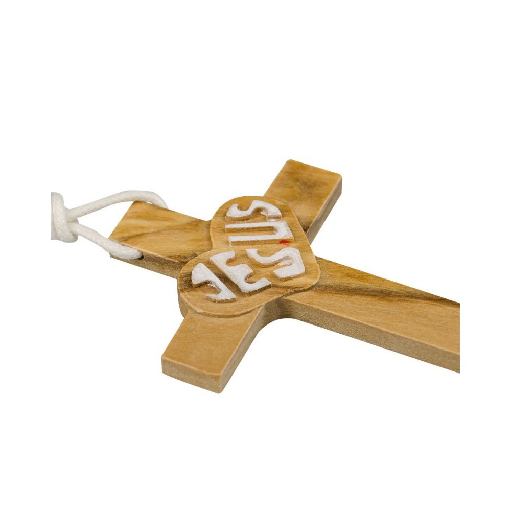 Pendete croce in Legno con scritta JESUS. Questa croce è arricchita da degli intagli dipinti in bianco che rappresentano la scritta JESUS. Ideale come ricordino per Prima Comunione o Cresima. Corredata di cordoncino bianco.