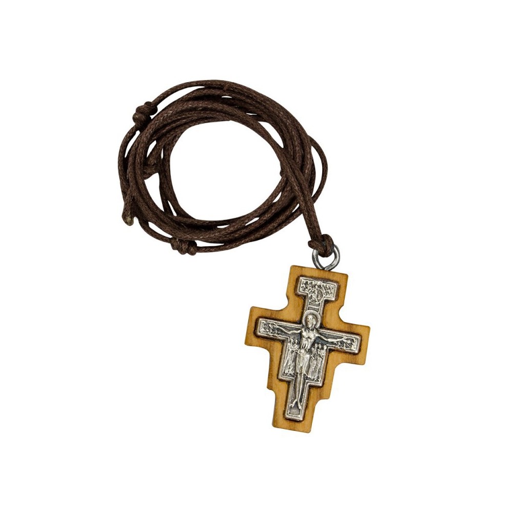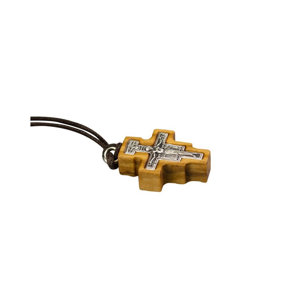La croce è realizzata in metallo su legno di ulivo, misura 2,5x1,5 cm. La particolarità è lo sfondo del crocifisso in metallo.