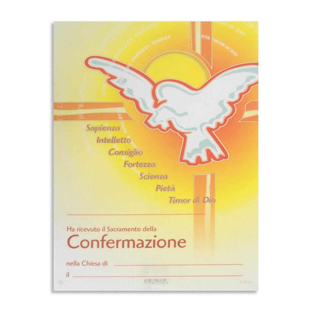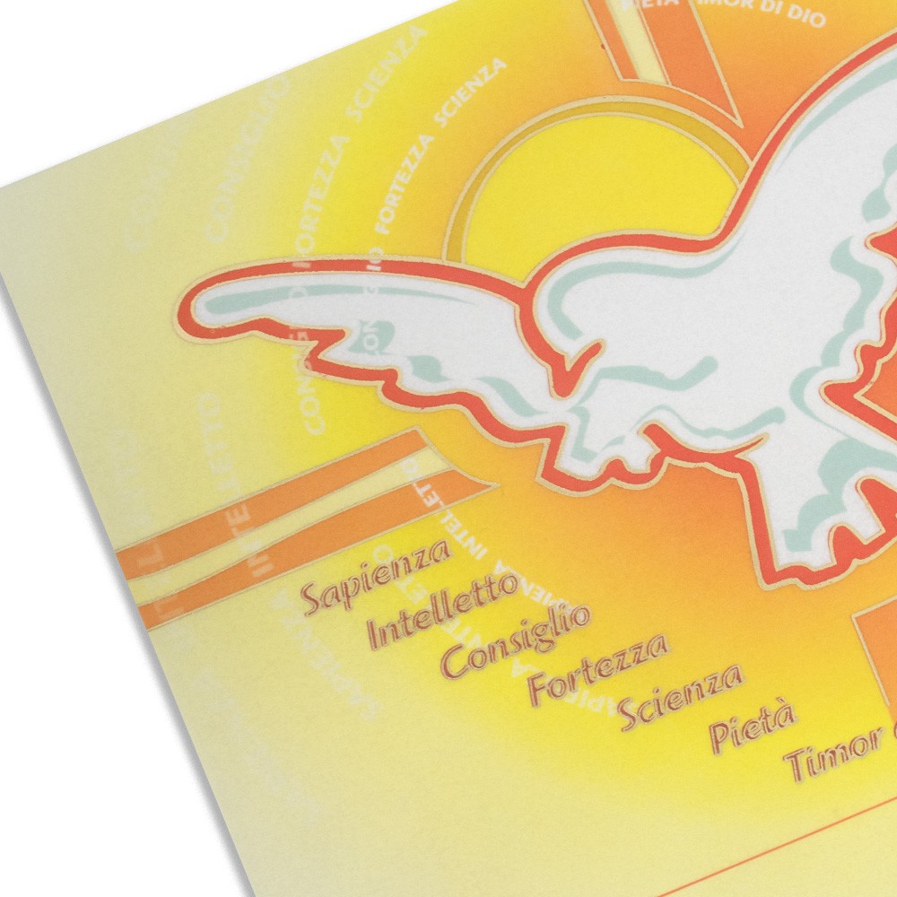 Diploma ricordo per la Cresima, realizzato su carta pergamena con immagine della colomba (Spirito Santo) e i 7 doni simboli liturgici della Confermazione.