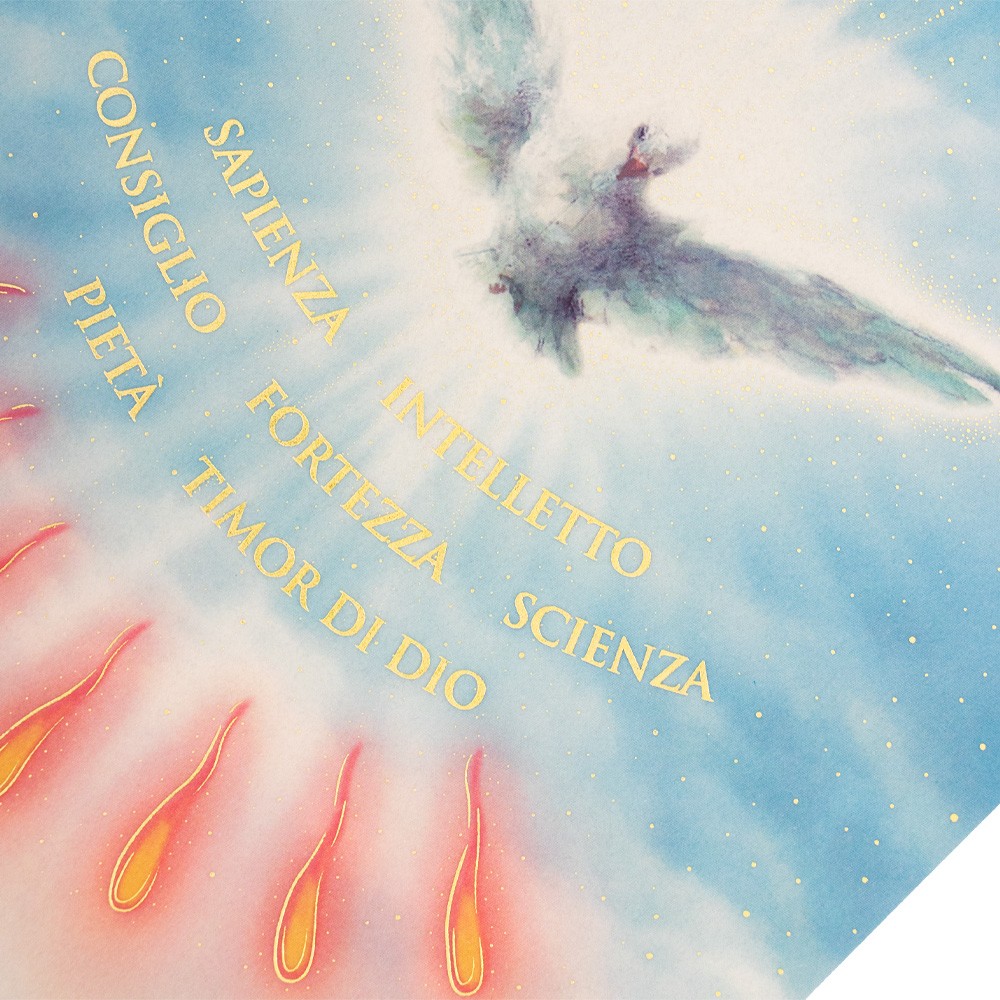 Ricordo speciale per la Santa Cresima / Confermazione, stampato su carta pergamena lucida e impreziosito da eleganti dettagli in oro a caldo, può essere personalizzato con il nome della chiesa, la data della celebrazione e il nome del parroco.
