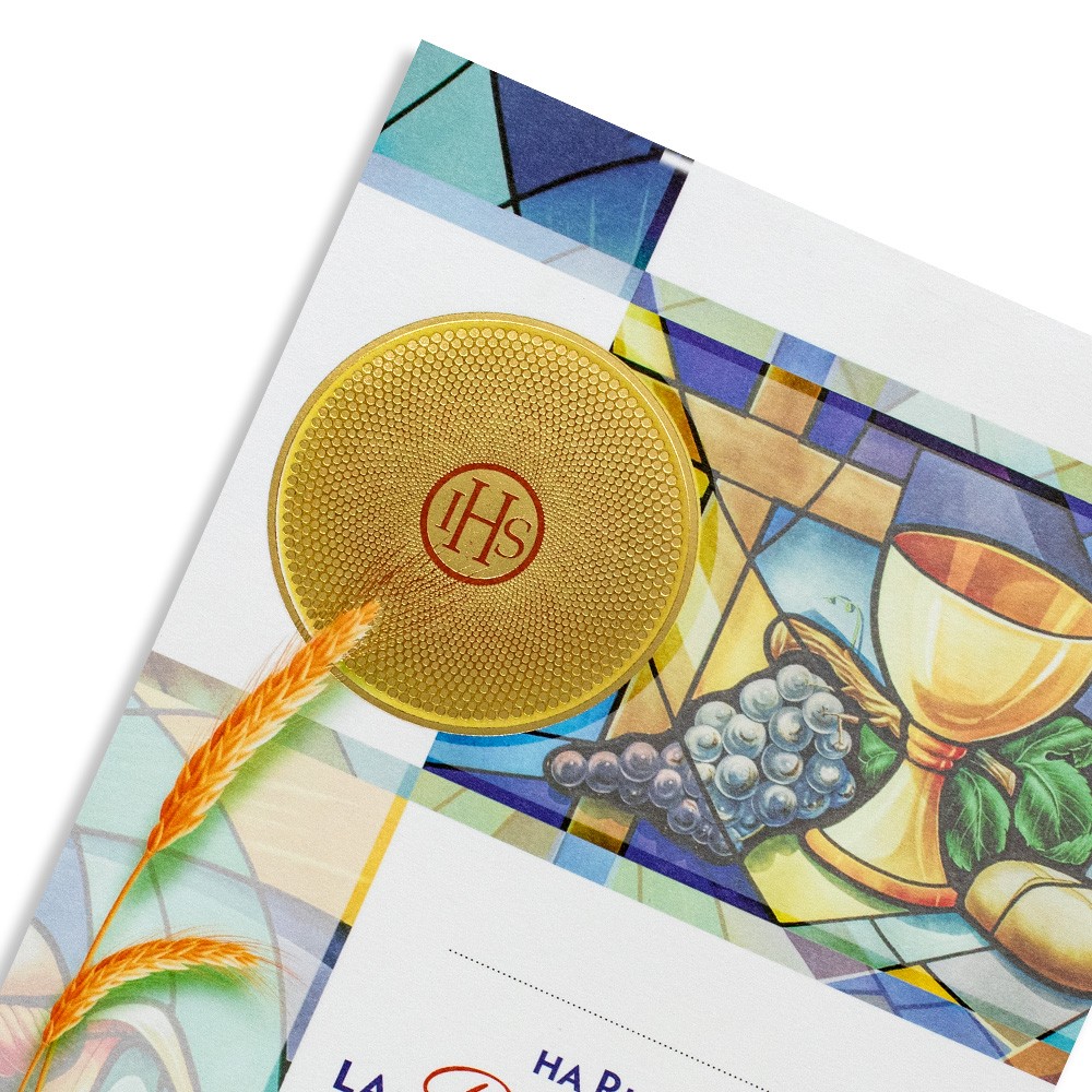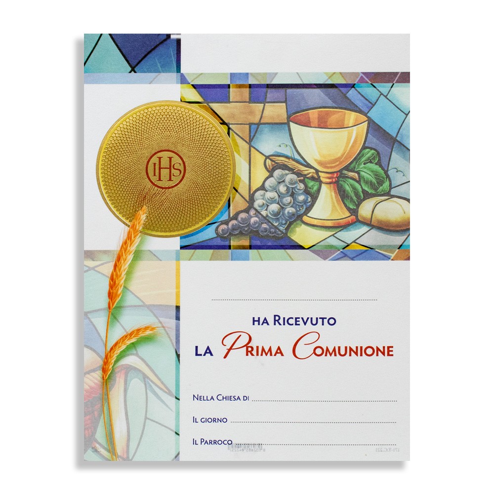 Le immagini riportate sulla pergamena sono con riflessi oro a caldo, raffigurante i simboli eucaristici della Prima Comunione.
