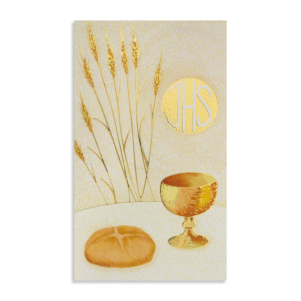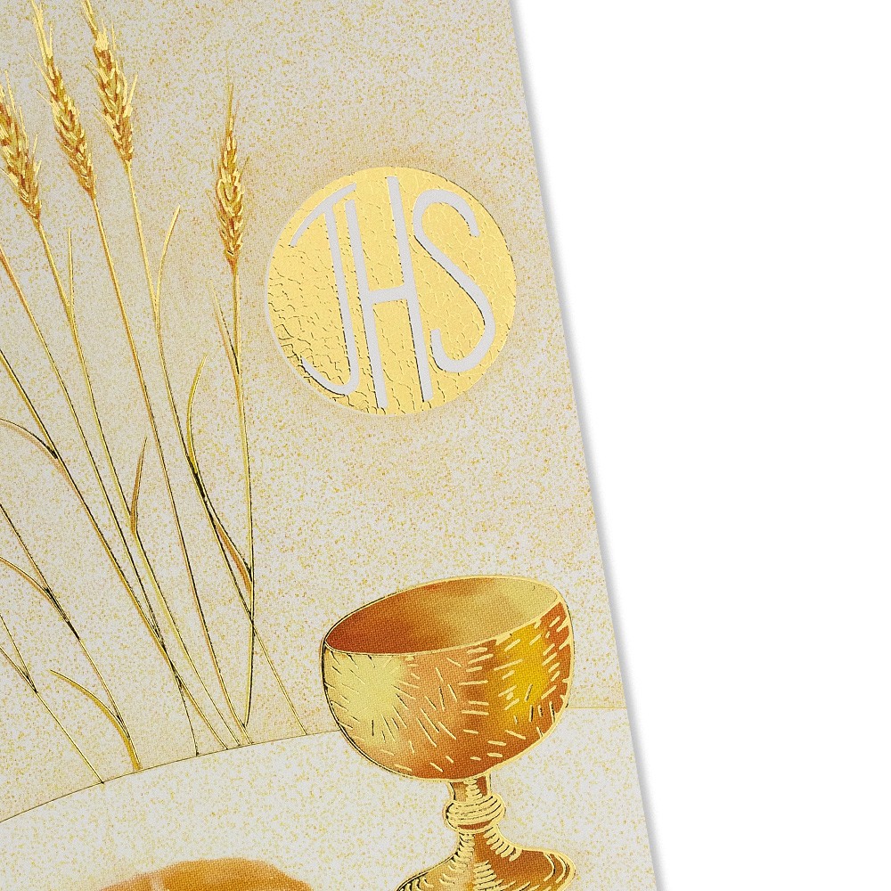 L'immaginetta ritrae i simboli eucaristici del sacramento ed è decorata con dettagli in oro a caldo.