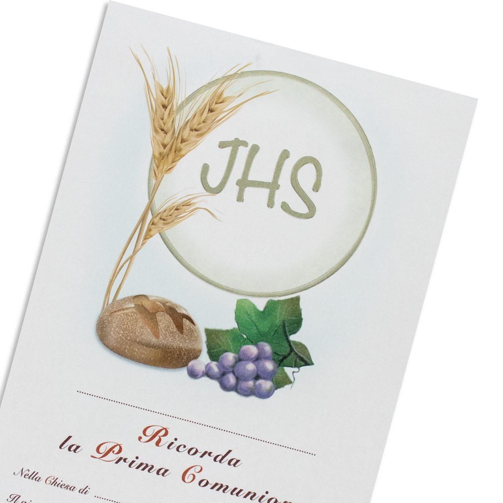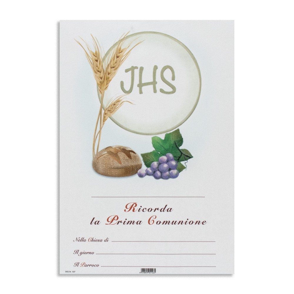 Attestato in ricordo della Prima Comunione, realizzato su carta pergamena decorato con simboli eucaristici pane, grappoli d'uva, spighe di grano e JHS.
