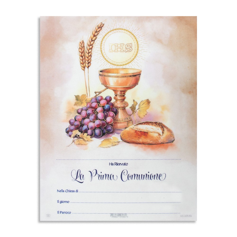 Diploma stampato su carta pergamena da regalare ai bambini dopo aver ricevuto il sacramento della Prima Comunione.