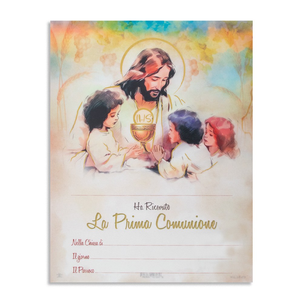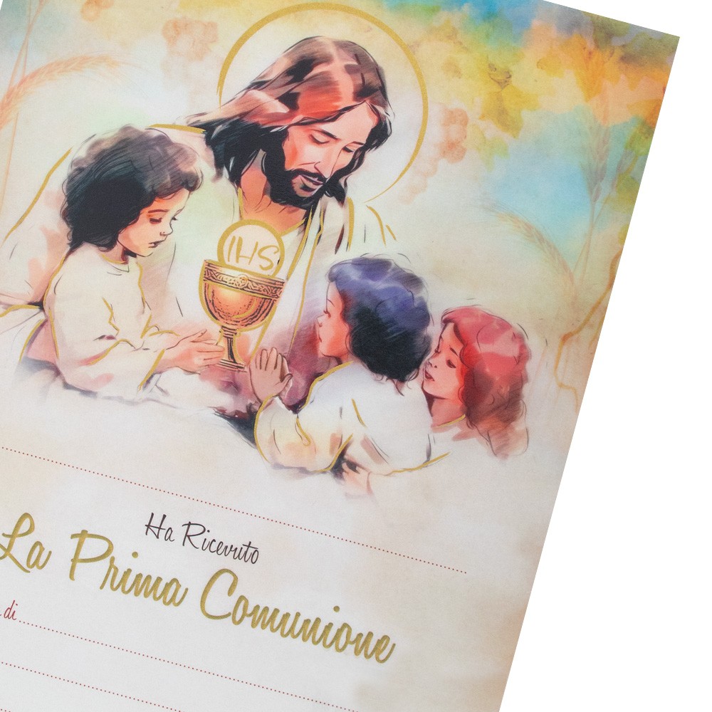 Attestato lavorato e stampato su carta pergamena da regalare ai bambini dopo aver ricevuto il sacramento della Prima Comunione.